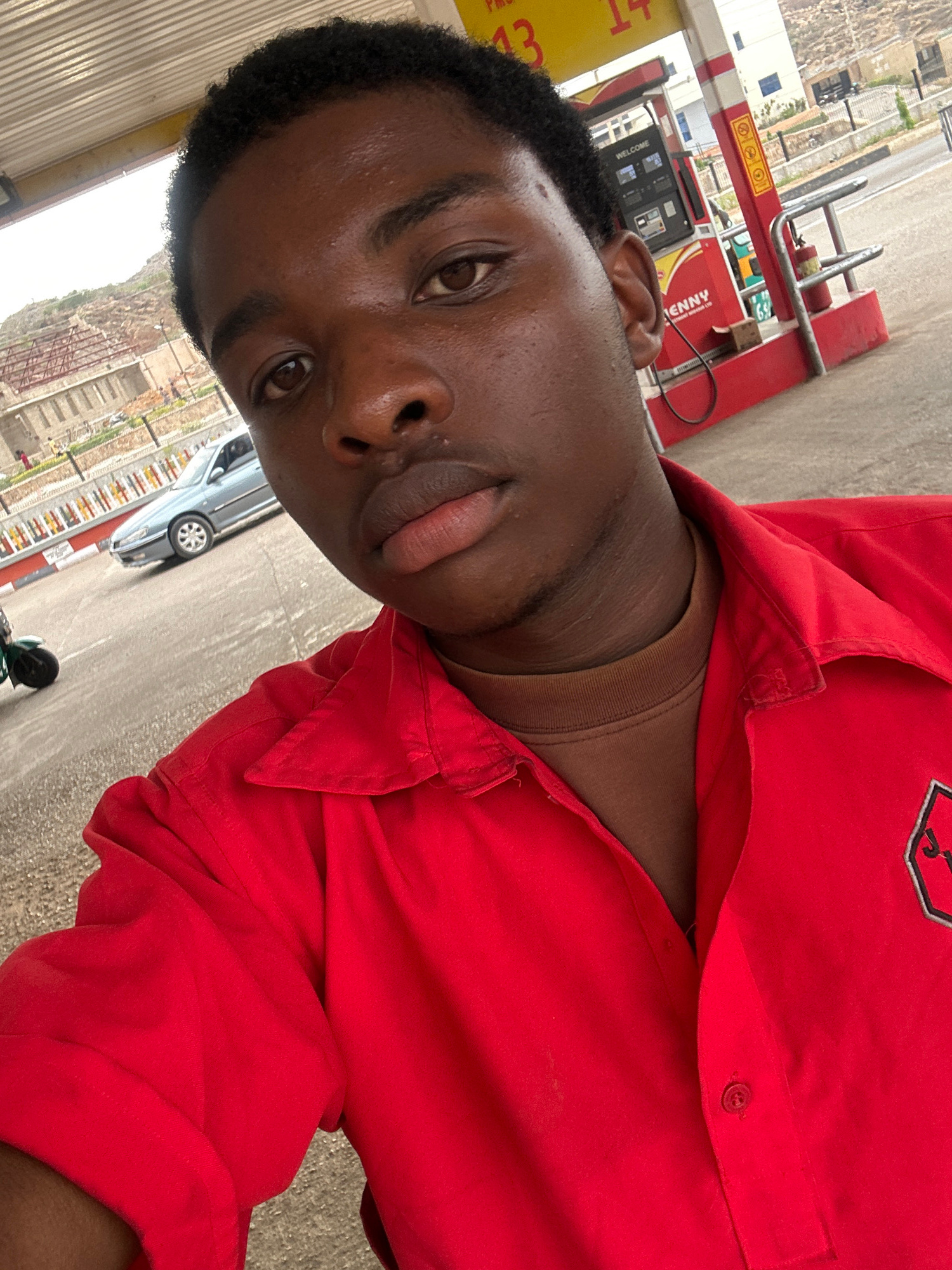 The image is a portrait of a young Black man, captured in an upward-angled selfie, set at a gas station in Jos, Nigeria. The man, with dark skin, short dark curly hair, and dark eyes, looks directly a…read more