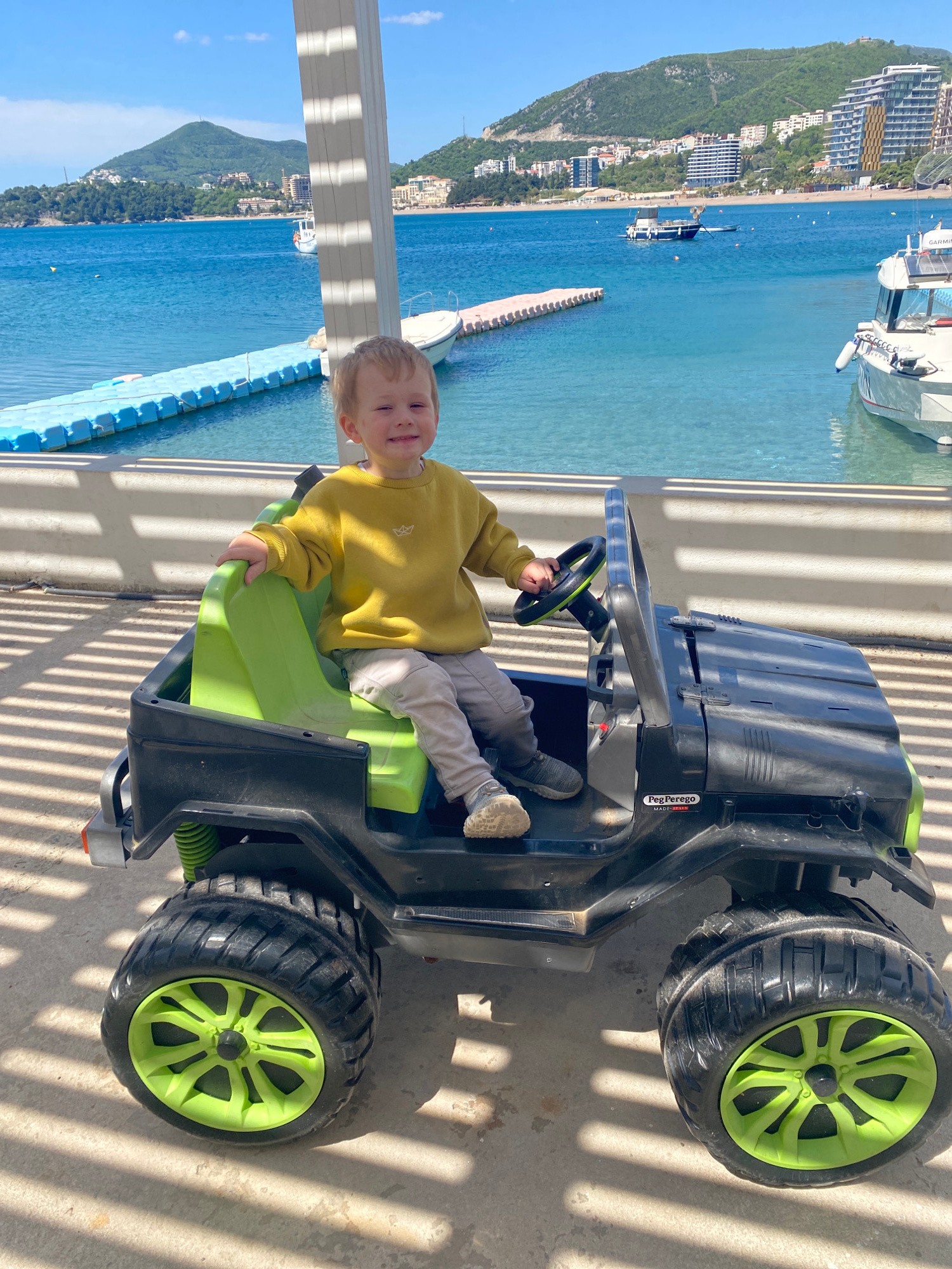 A young child sits in a green and black toy jeep on a sunny day, likely in Rafailovići, Montenegro. The child is wearing a yellow sweater and light-colored pants, and is holding the steering wheel. Be…read more