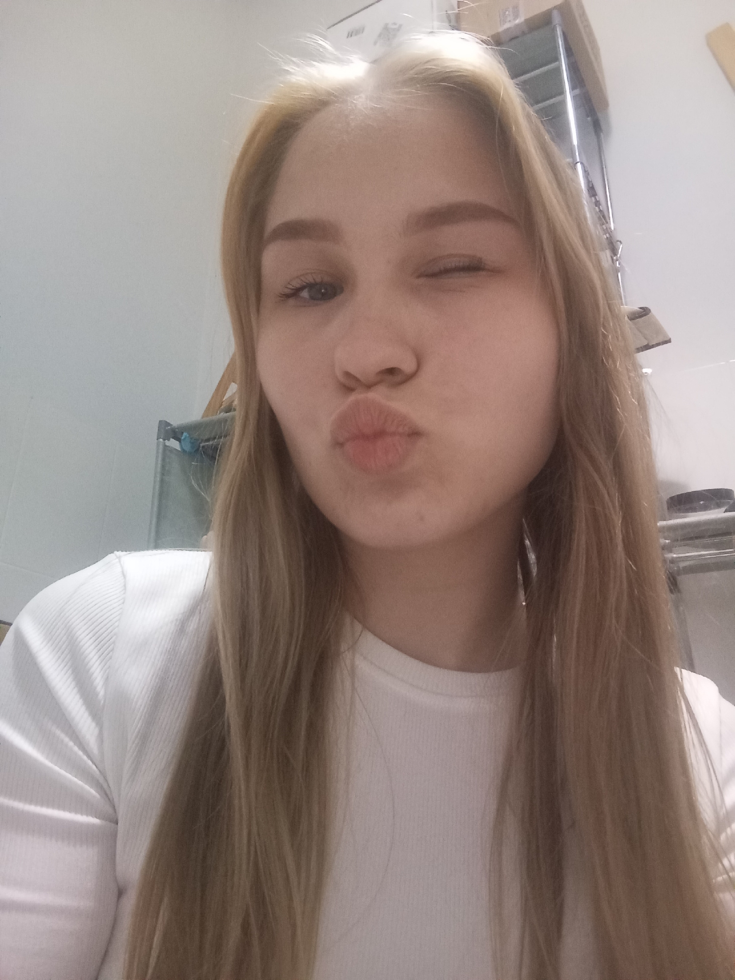 A young woman with light blonde hair, wearing a white ribbed long-sleeved shirt, is posing for a selfie. She is winking her left eye and puckering her lips into a kiss. The background is a plain whiteβ¦read more