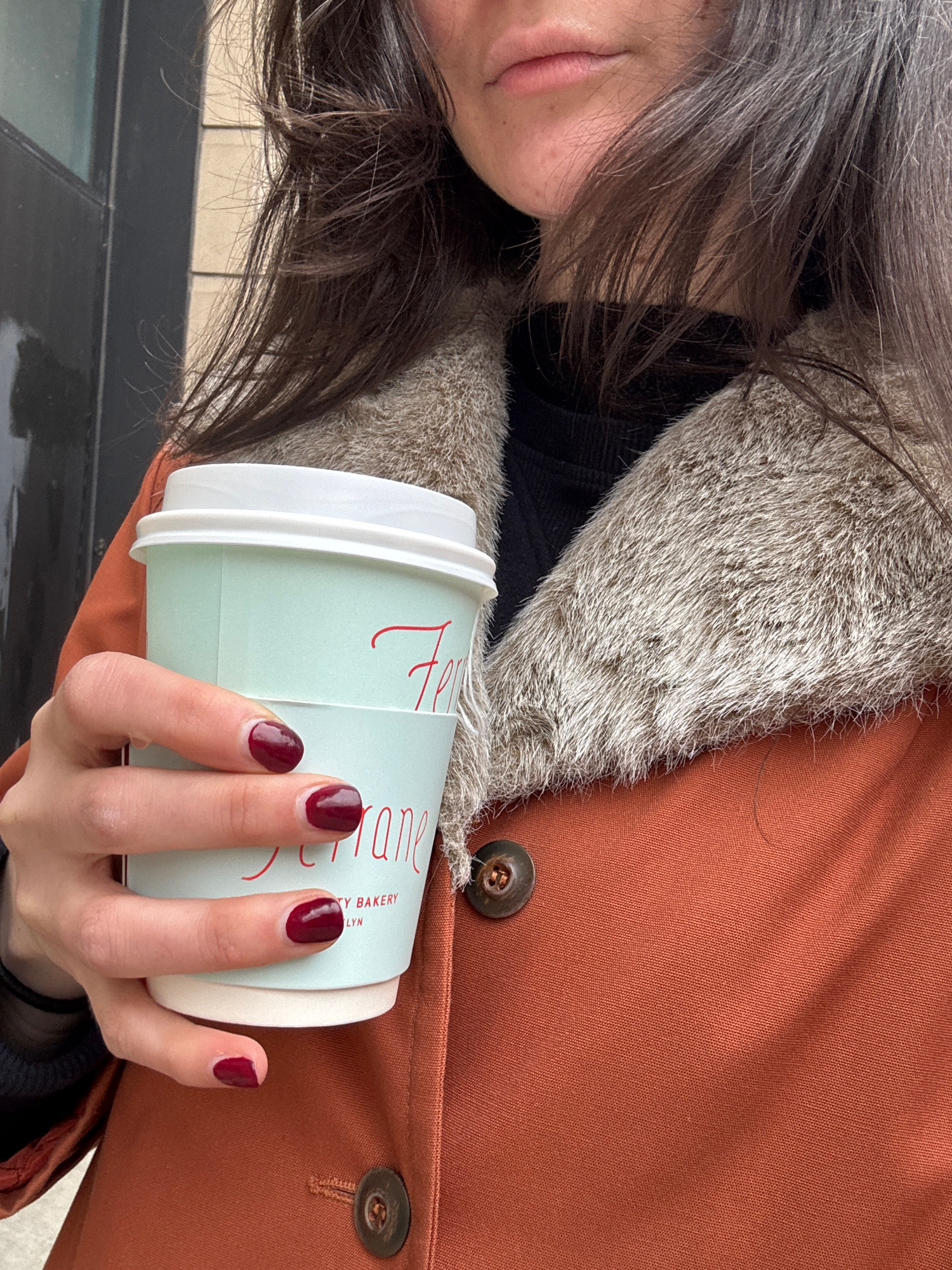 A woman's partial face and hand holding a Ferarane Bakery coffee cup in New York City, United States, are the focus of this shot. Her dark hair with gray streaks contrasts with the light tan furry col…read more