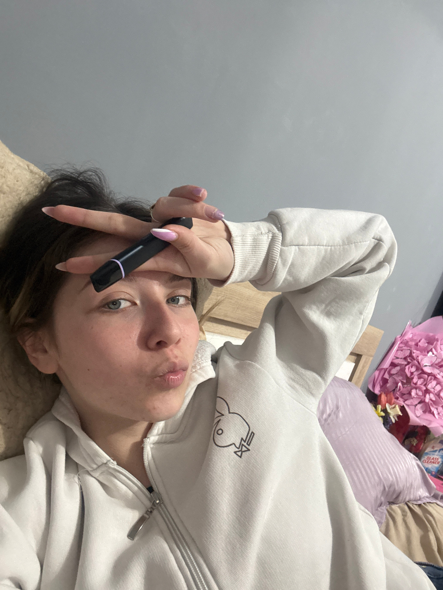 A young woman is lying on a beige surface, possibly a bed, wearing a white zip-up hoodie with a cartoon logo on the left breast. She is holding a black marker with a purple tip near her forehead with…read more