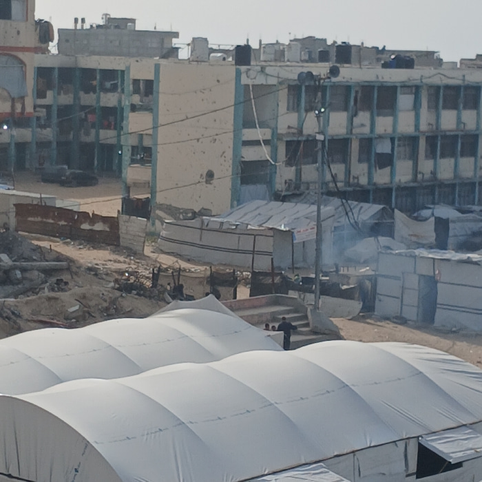 The image depicts an outdoor urban landscape in the city of Gaza, Palestinian Territory. In the foreground, several large, white, arched fabric structures, consistent with temporary shelters or facil…read more