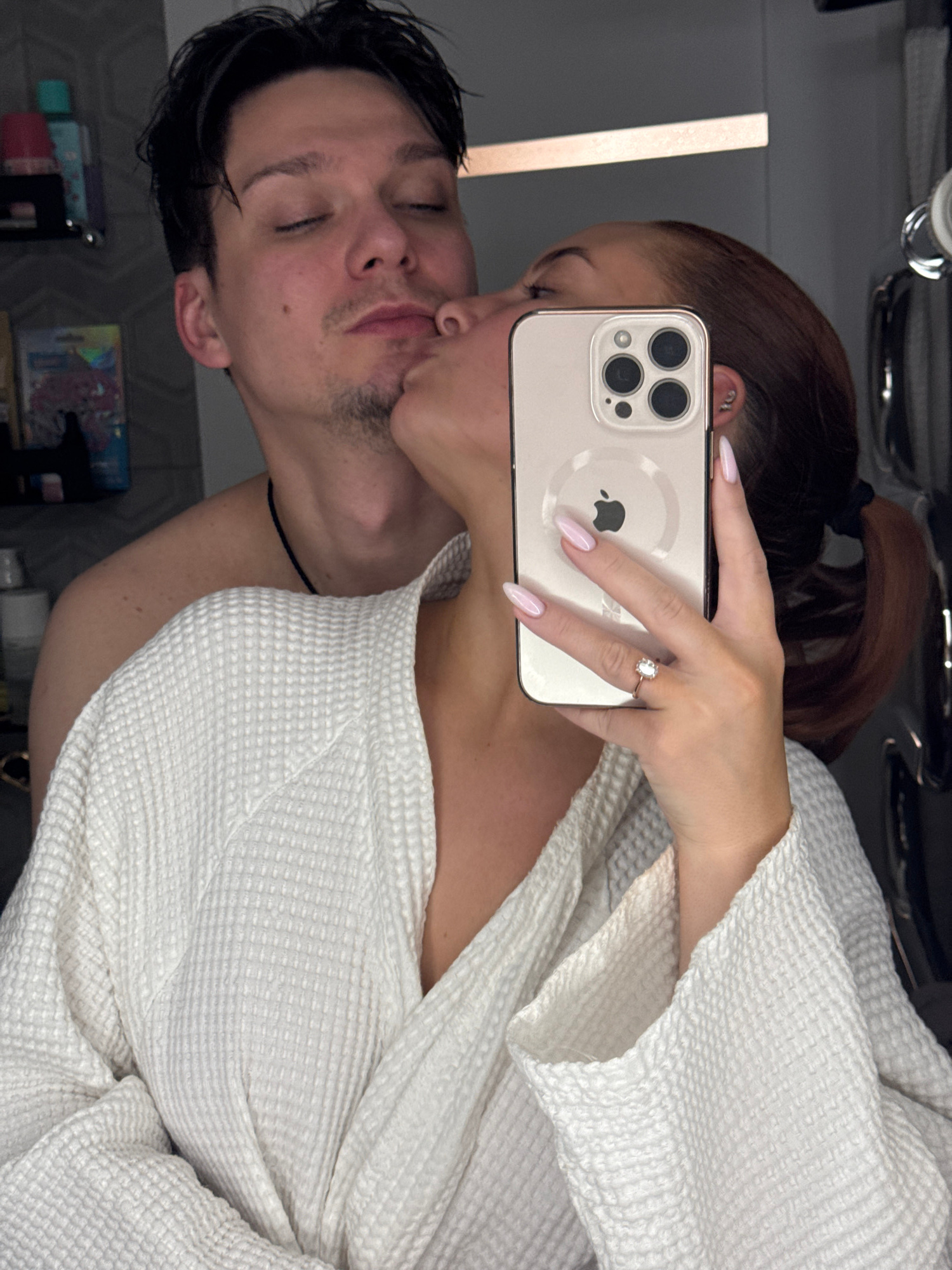 A couple is taking a selfie in a mirror. The woman is holding the phone, her face close to the mirror, while kissing the man, who has his eyes closed. The woman has reddish-brown hair pulled back in a…read more