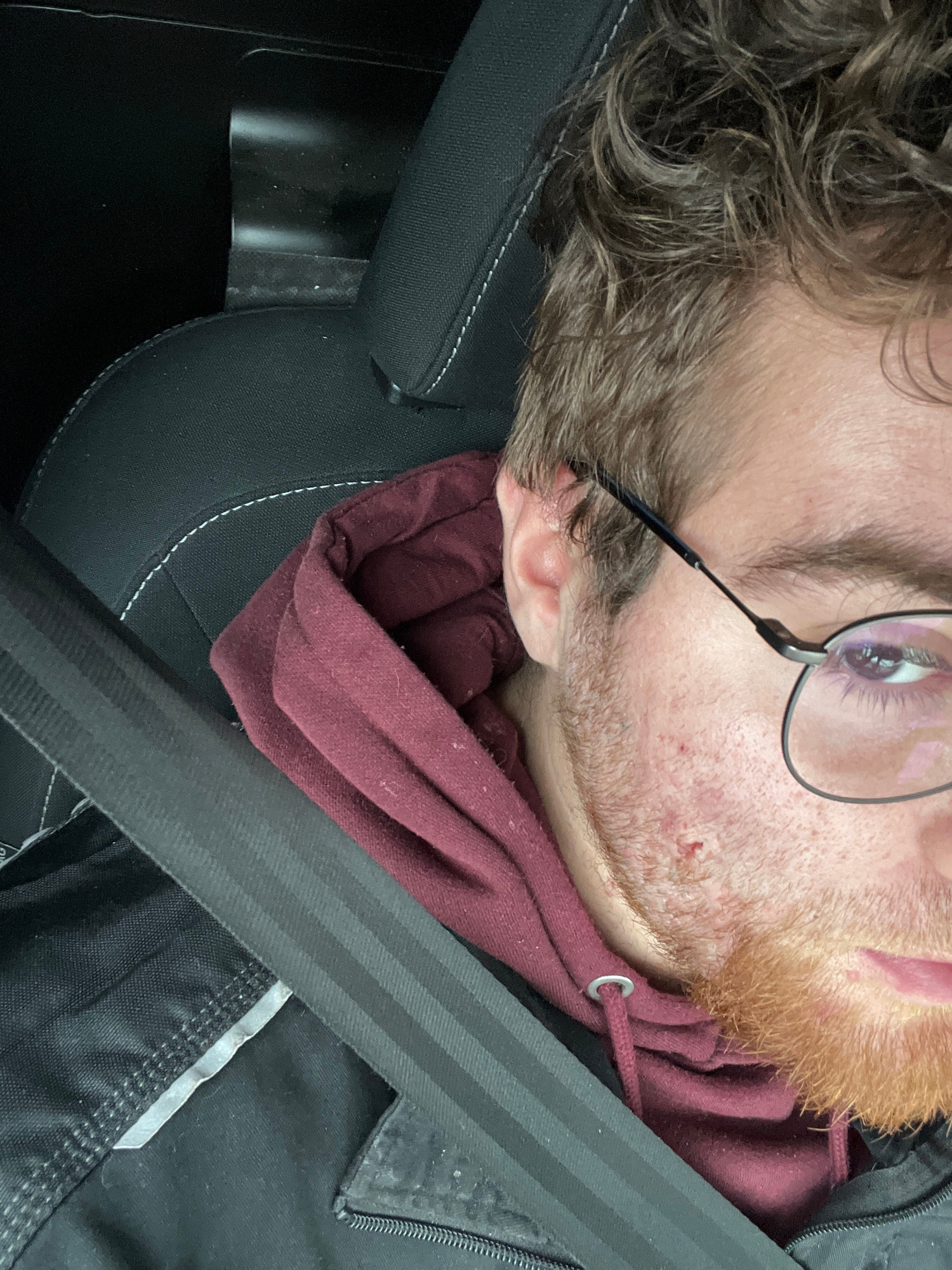 The image shows a person, likely male, wearing glasses and a maroon hoodie, lying with their head resting against a car seat. They are secured with a seatbelt. The person's face is visible, showing a…read more