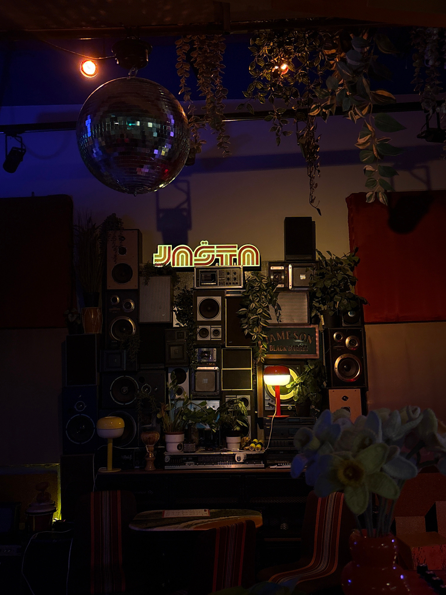 The image captures an interior scene, likely within a bar or club in Belgrade, Serbia. Dominating the left side is a disco ball hanging from the ceiling, reflecting light and creating a festive atmosp…read more