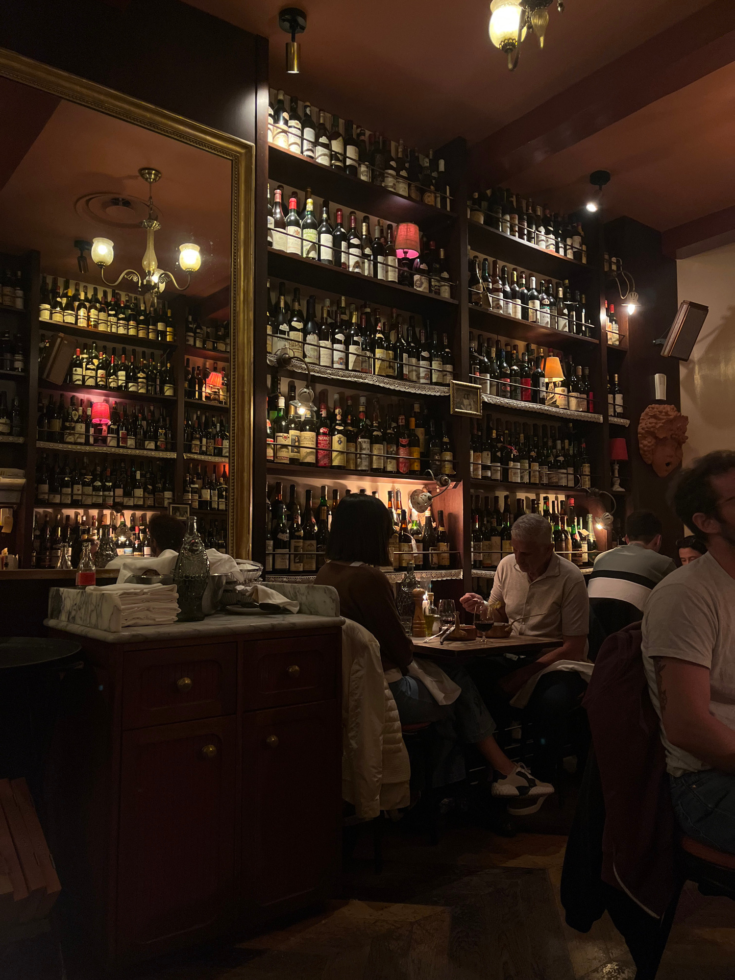 The image captures the dimly lit interior of a wine bar, likely located in Lyon, France, as evidenced by the style of the decor and the presence of wine bottles. Floor-to-ceiling wine racks, densely f…read more
