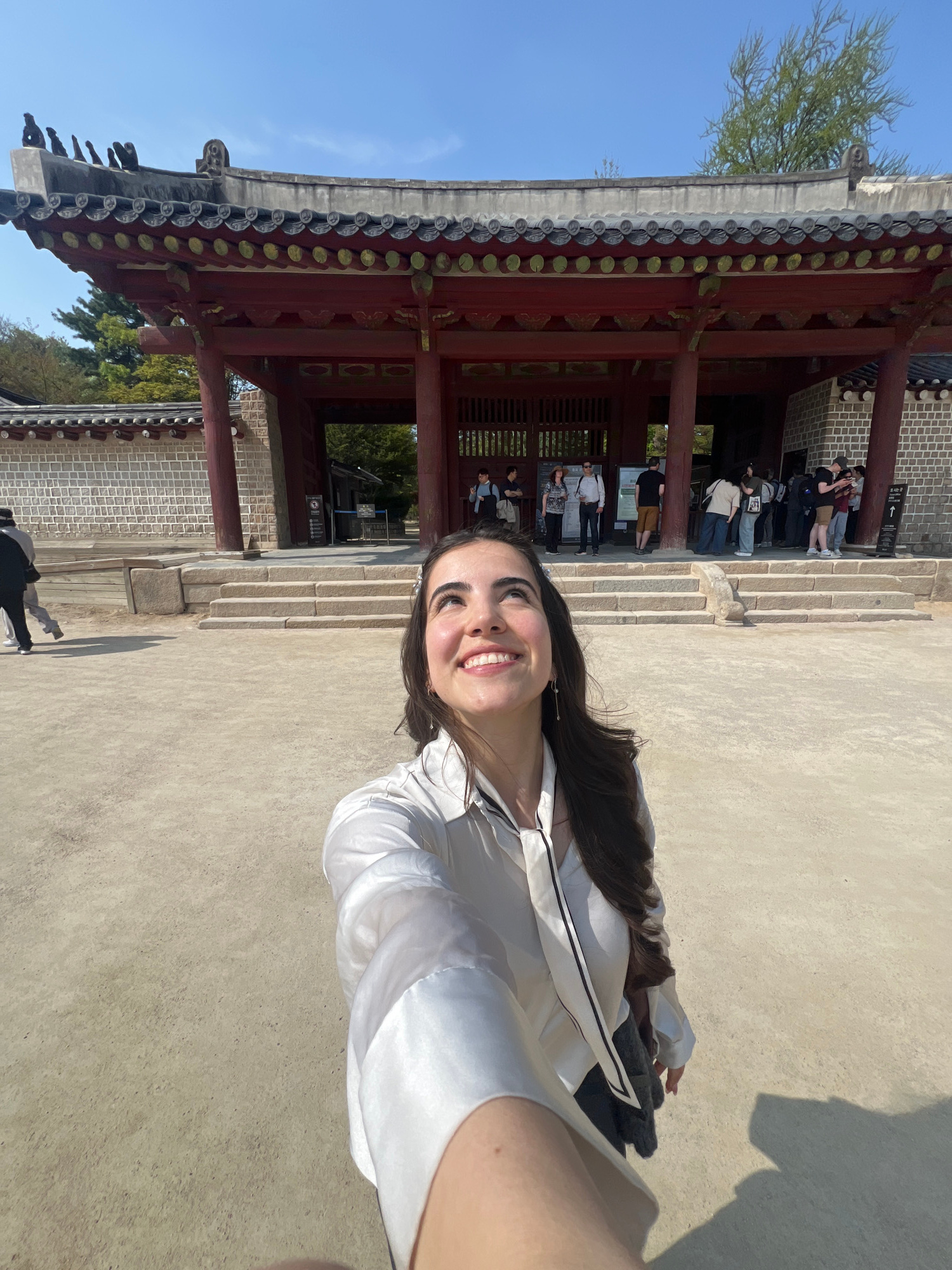 A young woman is taking a selfie in front of a traditional Korean building. The building has red wooden pillars, a tiled roof, and brick walls. A group of people is standing near the stairs of the bui…read more