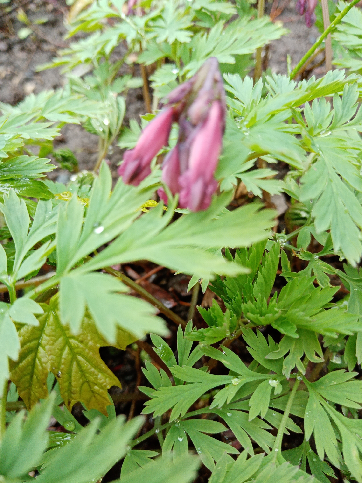 The image depicts a close-up view of a bleeding heart plant in a garden, with the main subject being the pink, heart-shaped flowers and the green, fern-like foliage. Dewdrops are visible on the leaves…read more