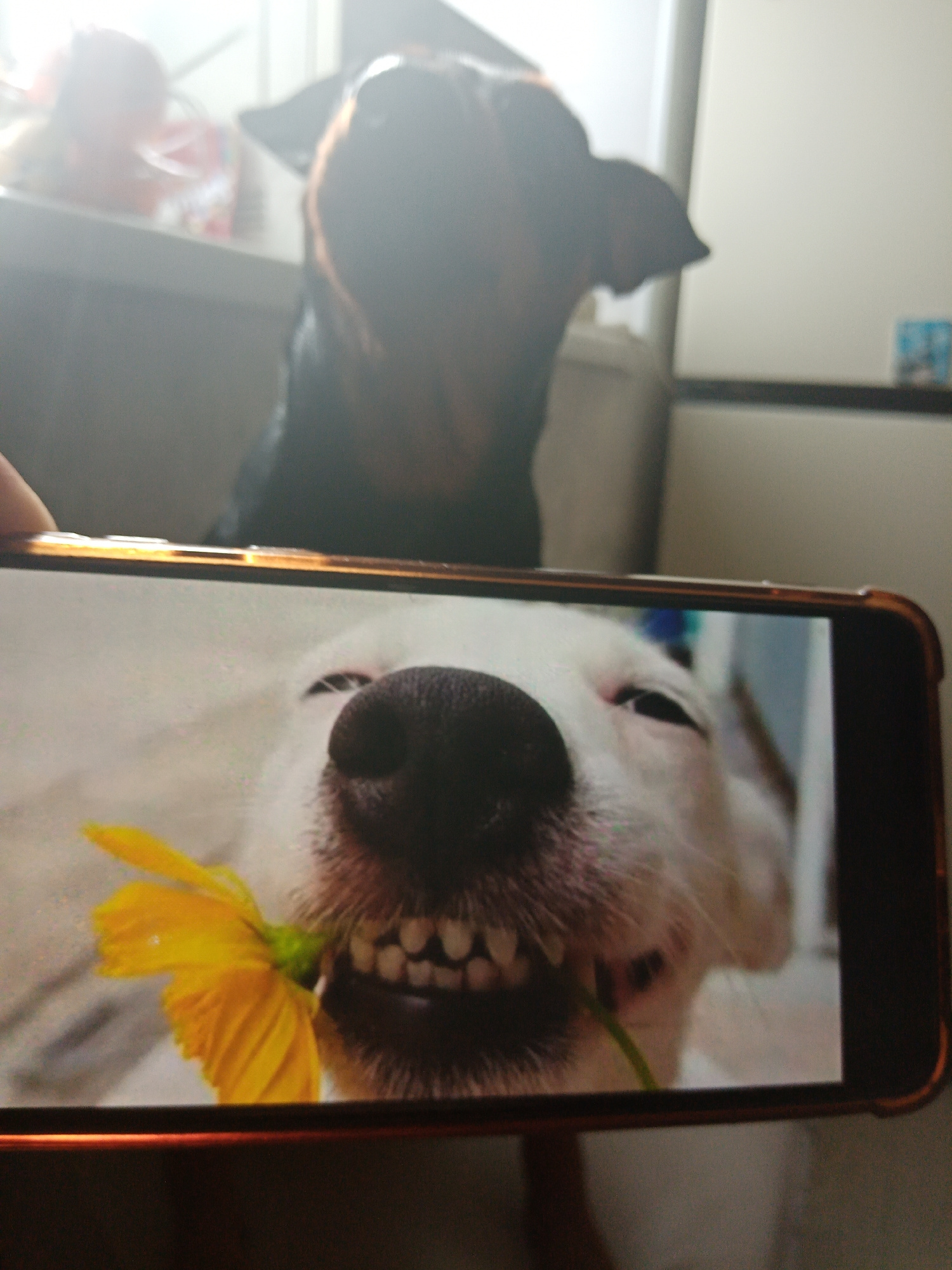The image displays a close-up view of a smartphone, held by a person whose thumb and index finger are visible at the top and bottom of the device. The smartphone's screen shows a photograph of a white…read more