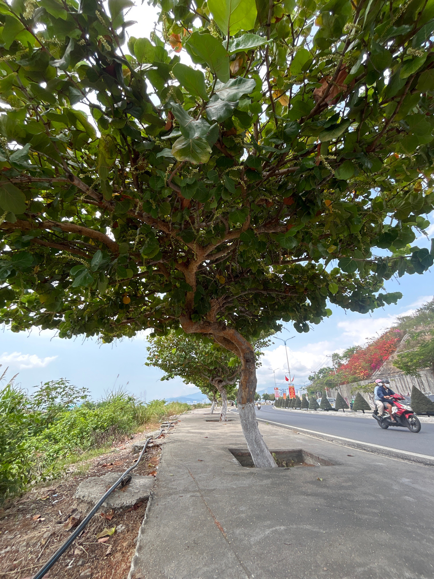 The image presents an upward-tilted perspective of a tree situated in an urban environment, possibly in the city of Bắc Nha Trang, Vietnam. The tree's trunk is visible, extending from a square cut-out…read more