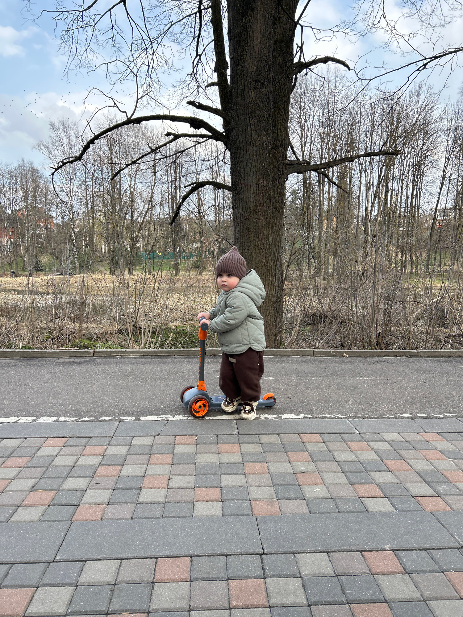 A child is on a scooter on a brick sidewalk next to a paved road in Klin, Russia, on a day with bare trees and a partly cloudy sky. The child wears a brown knit hat, light green jacket, and brown pant…read more