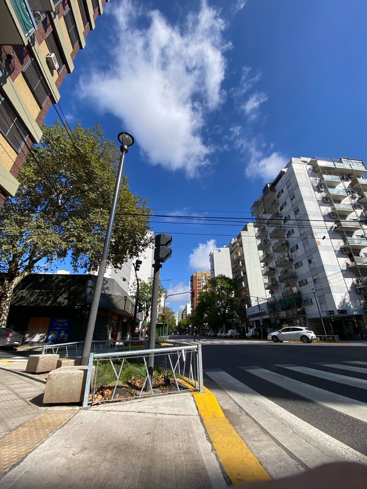 The image shows a street scene in Buenos Aires, Argentina, taken on a sunny day with a blue sky and scattered clouds. The photograph is taken from a pedestrian perspective on the sidewalk. To the righ…read more