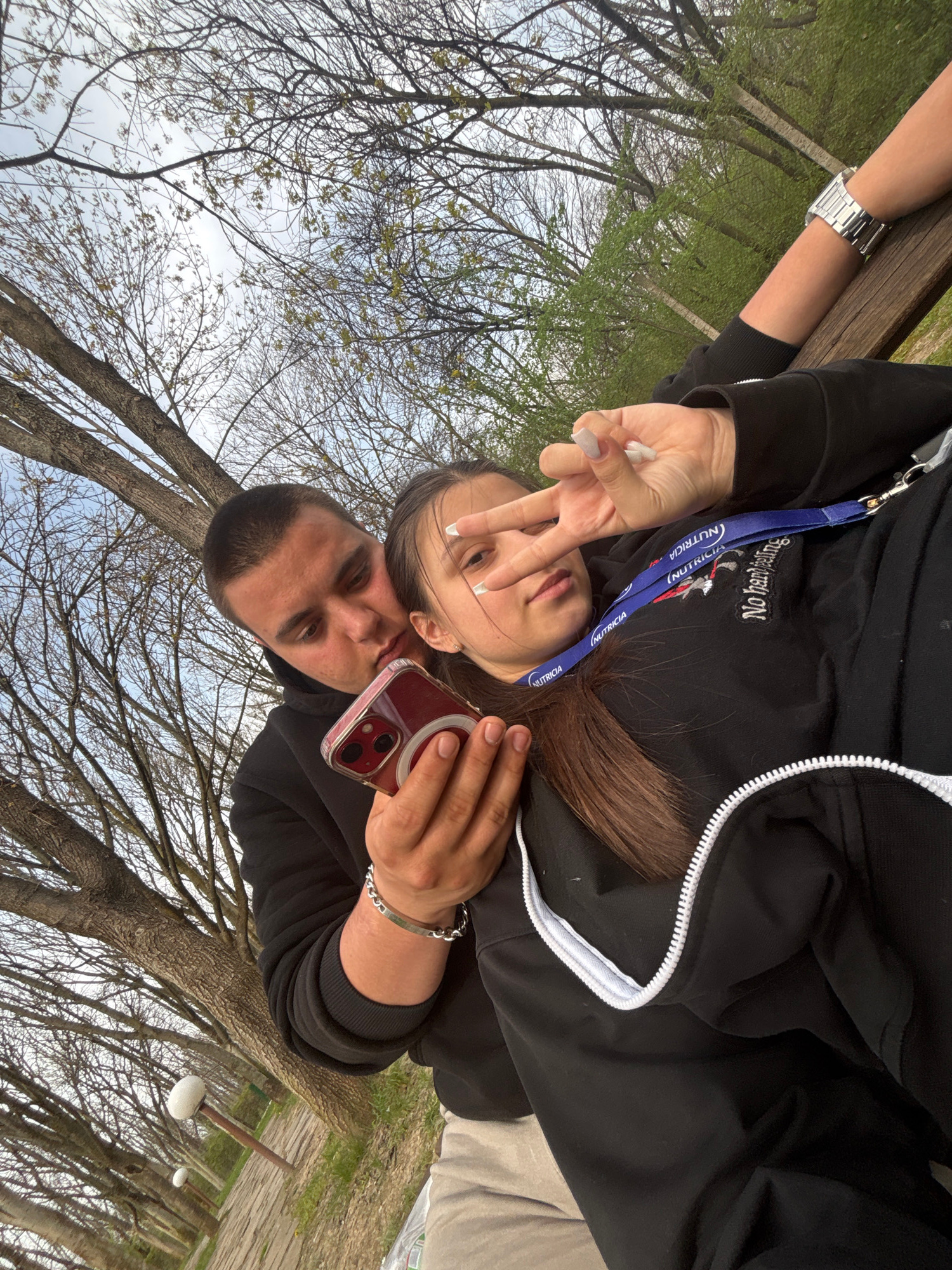 A selfie is taken by a man and a woman outdoors. The photo captures the couple from the chest up. The man is holding a red cellphone with a circular design on the back. The woman is making a peace sig…read more