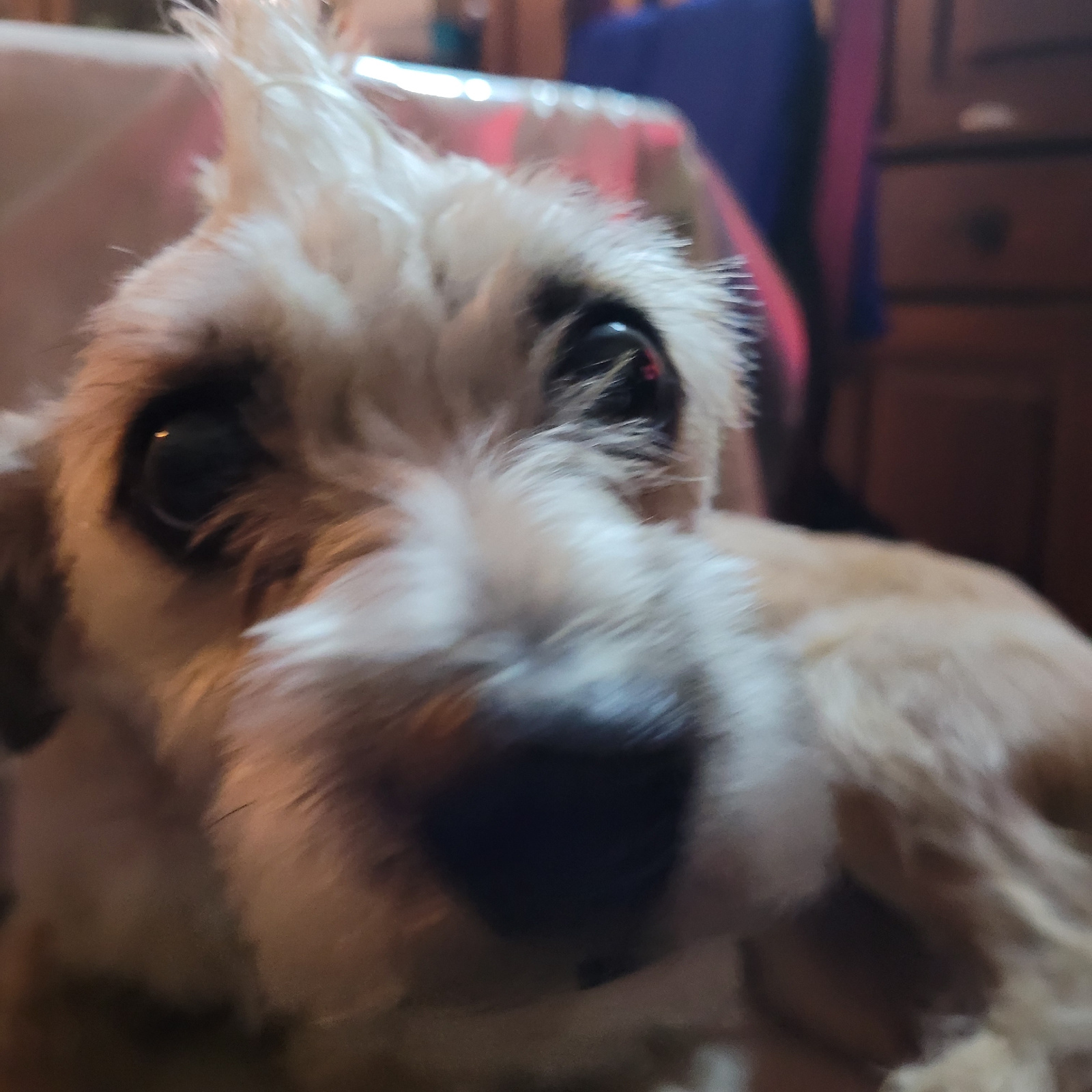 The image is a close-up shot of a dog's face, predominantly white and tan in color, with black eyes and a black nose. The dog's fur appears shaggy and unkempt, with individual hairs visible. The backg…read more