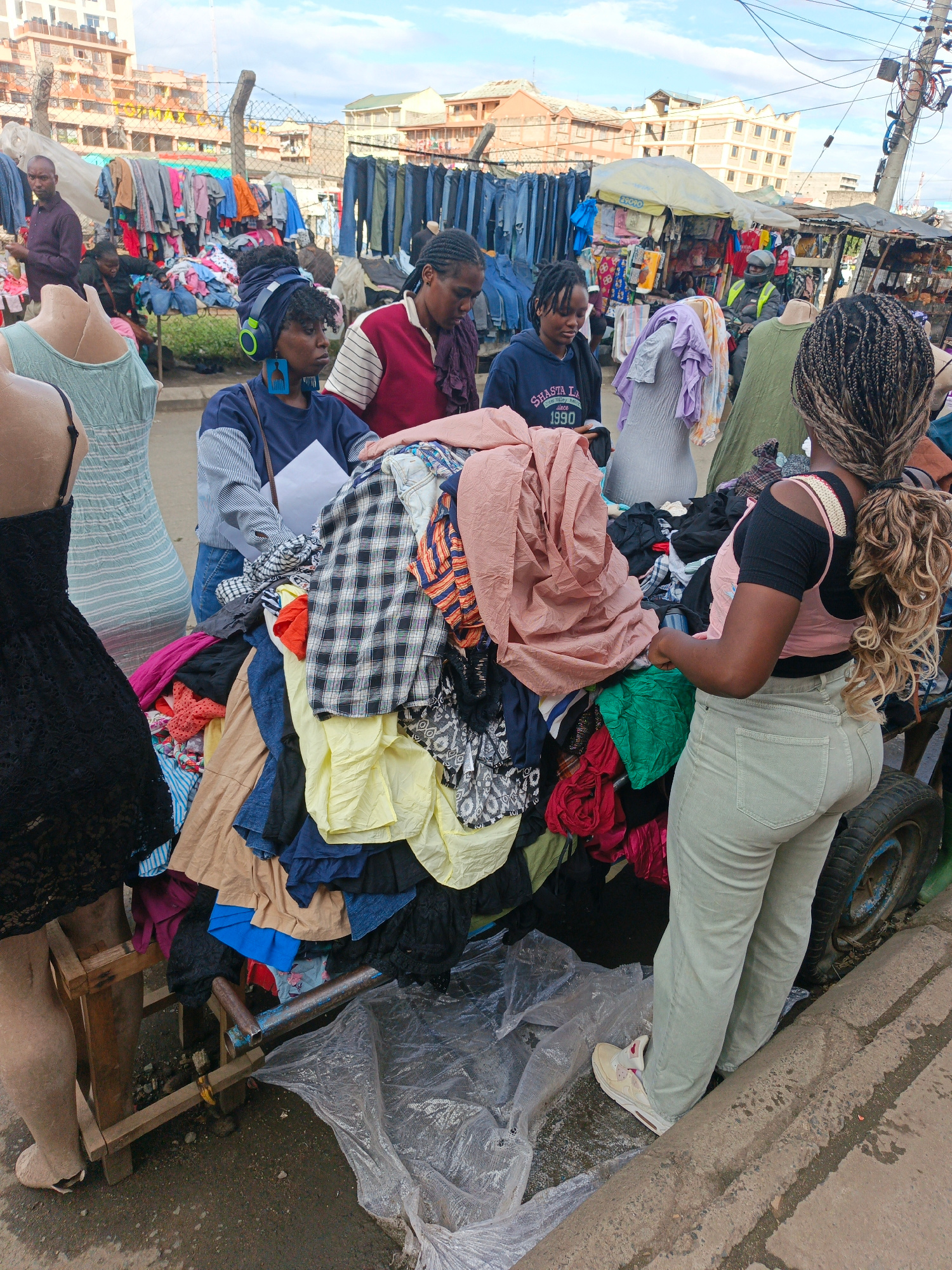 This daytime image depicts a bustling outdoor clothing market in Nairobi, Kenya, under a bright, partly cloudy sky. The central focus is a large wooden cart or stall overflowing with a diverse array o…read more