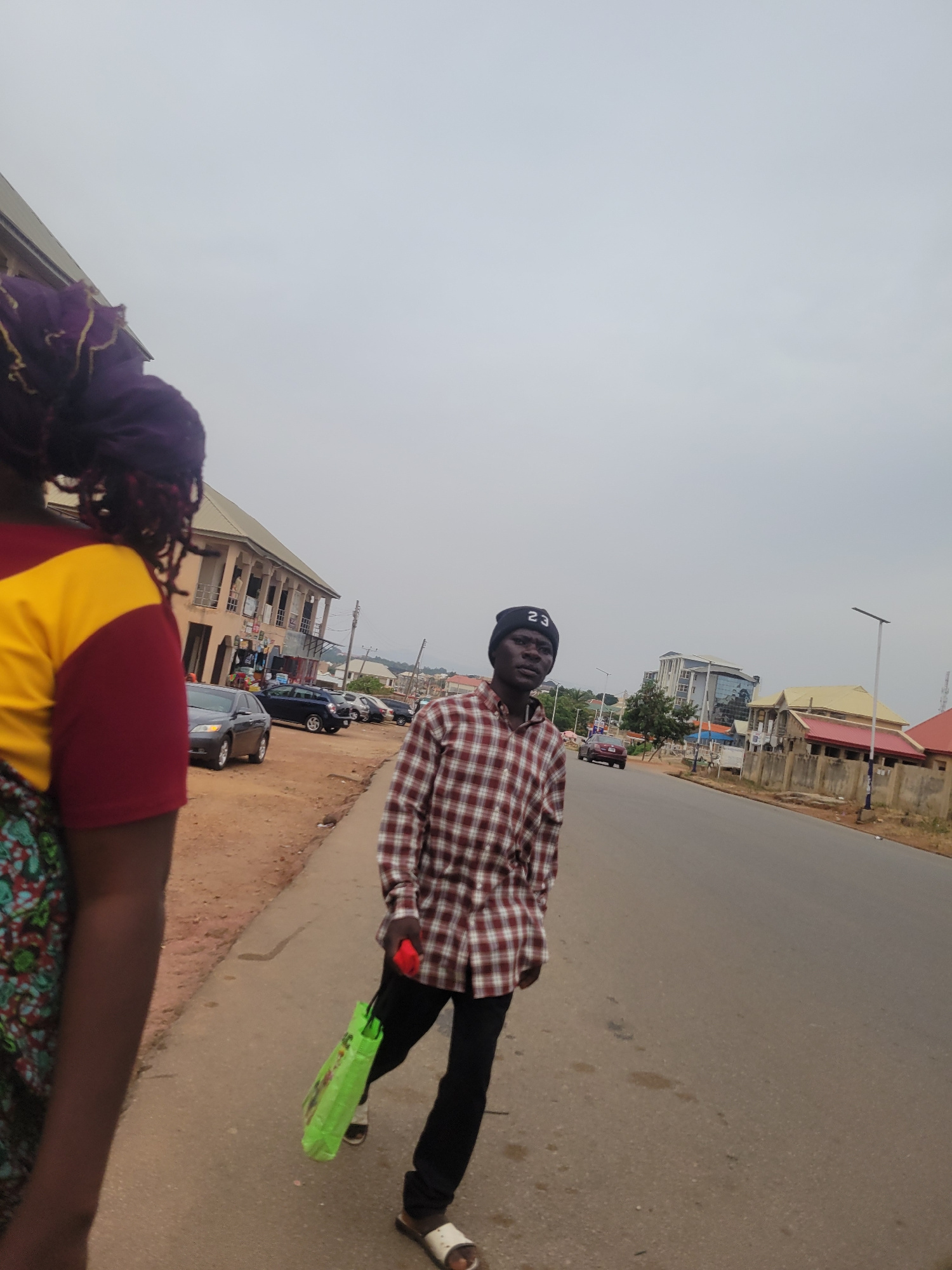 This image depicts an outdoor street scene in a town or city, likely in Jos, Nigeria, under an overcast sky. The perspective is slightly angled, showing a paved road extending into the distance, flankβ¦read more