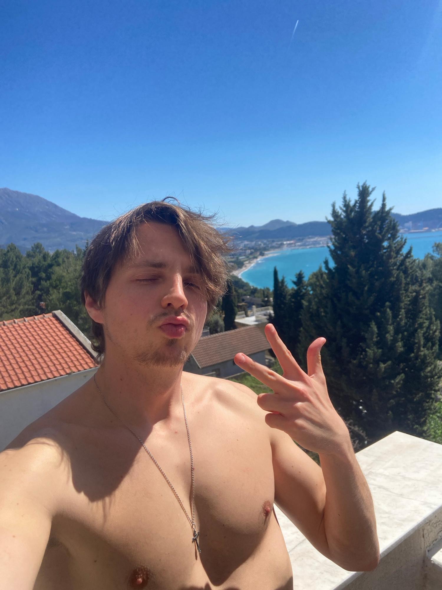A shirtless man stands on a balcony, making a hand gesture and a kissing face, in Šušanj, Montenegro. The backdrop includes the Adriatic Sea, mountains, and a clear blue sky. A dense evergreen tree is…read more