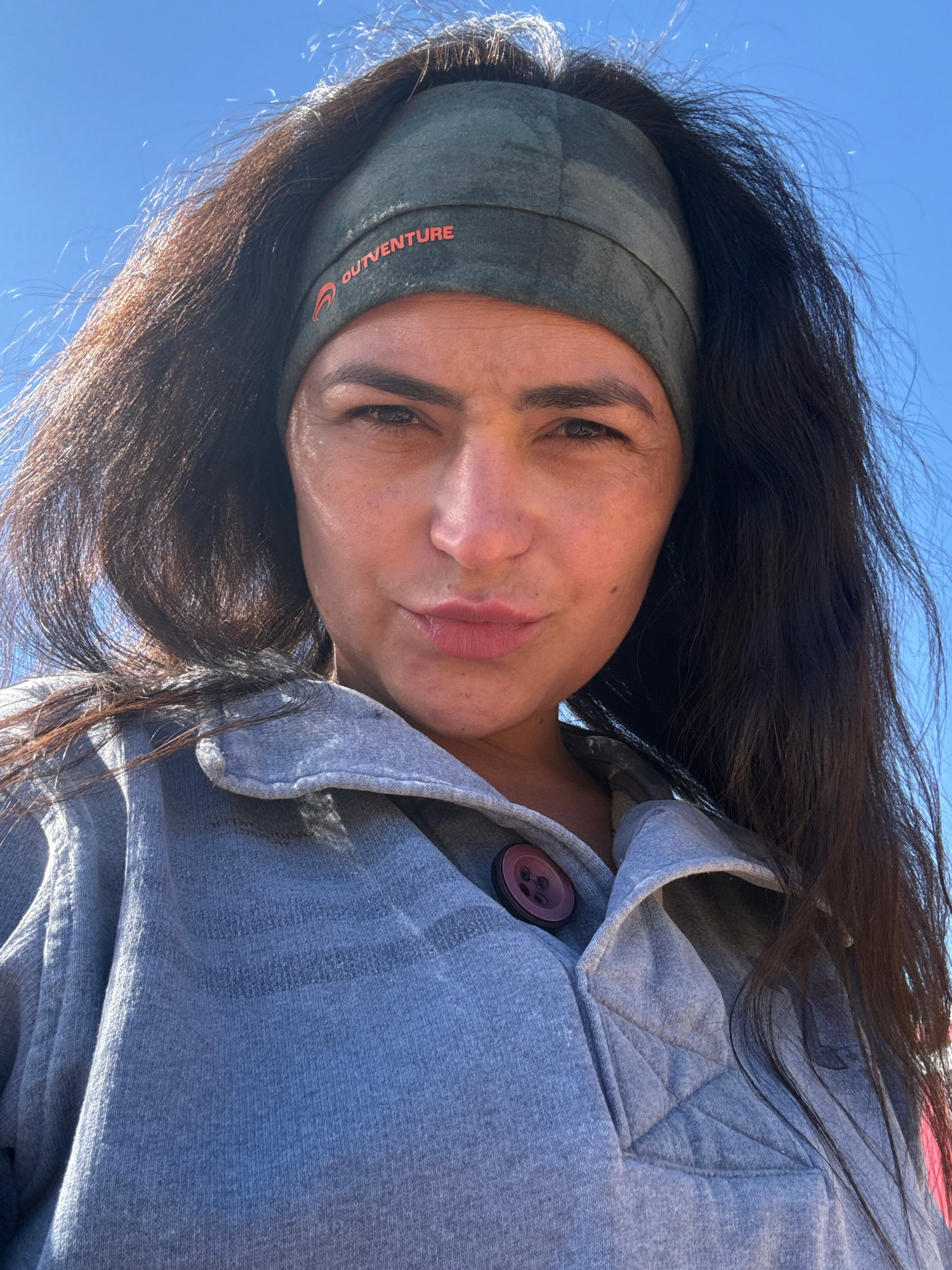A woman with long brown hair wearing a gray headband with "OUTVENTURE" written on it, and a blue button-up jacket, takes a selfie against a bright blue sky. The location is not discernible.