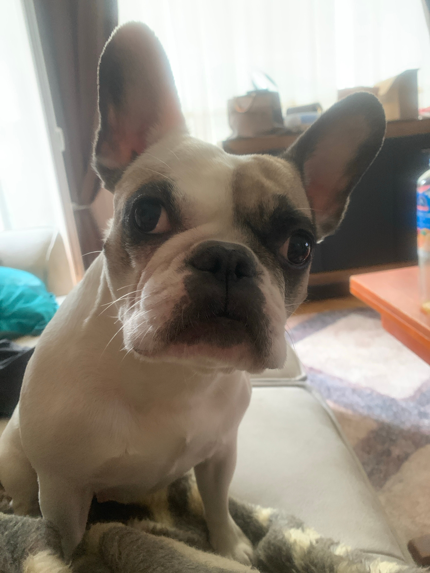 A close-up, slightly tilted, portrait photograph shows a French Bulldog. The dog has a white and brindle coat. One ear is fully upright. It is sitting on a gray patterned surface. The background inclu…read more