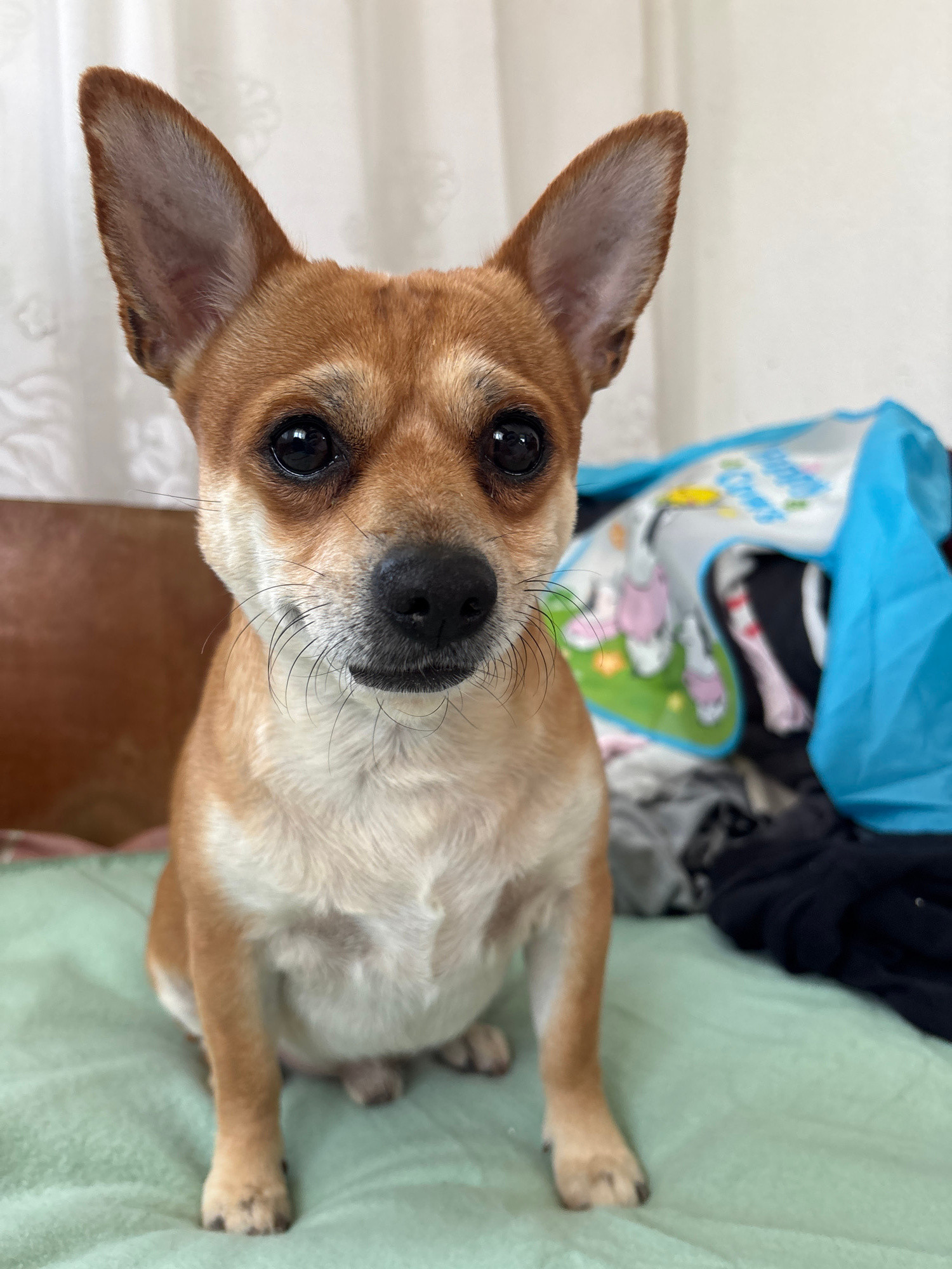 A tan and white Chihuahua dog is lying on a pale green surface, likely a bed. The dog faces the camera with its head tilted. It has large, dark eyes, a black nose, and prominent whiskers. Behind the d…read more