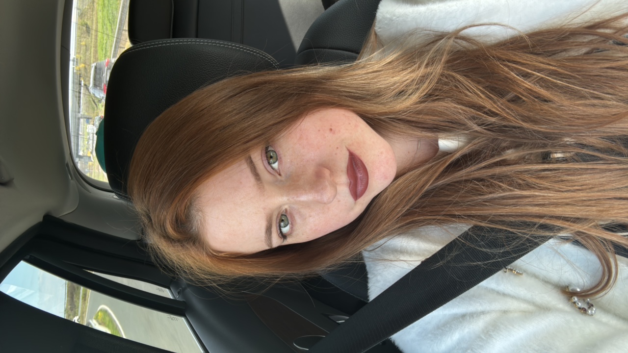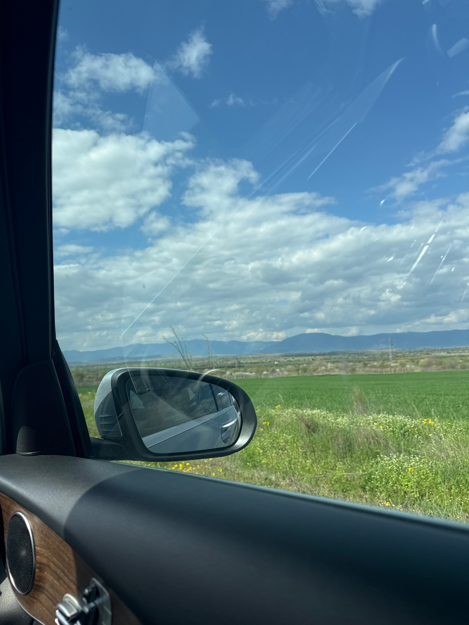 The image shows a view from inside a car. The car's side mirror and interior trim are visible. Through the window, there is a scene of a partly cloudy blue sky and an open grassy field in the distance…read more