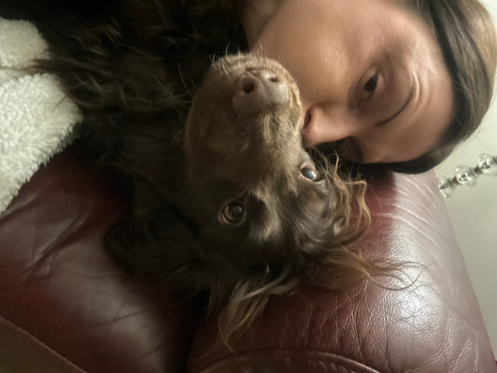 A woman hugs a brown dog with shaggy fur. The dog's head rests on the woman's face, near her nose. The dog is looking directly at the camera. They both are lying on a brown, likely leather, couch. A w…read more