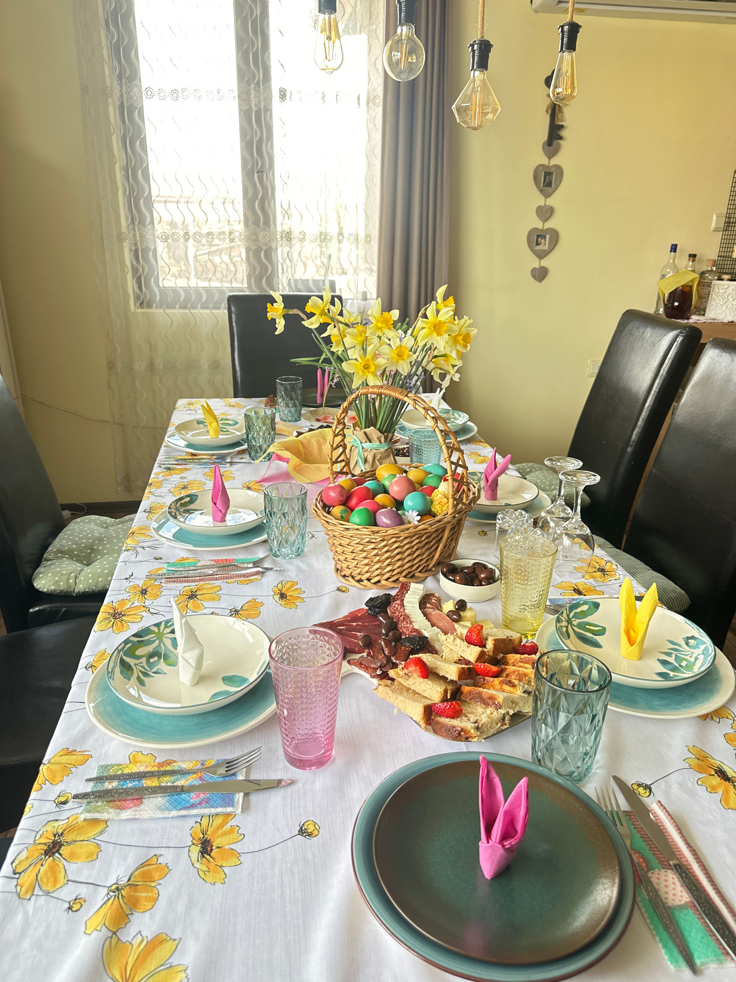 A dining table is set for Easter, featuring patterned plates, glasses, and folded napkins shaped like bunny ears. A basket filled with colorful Easter eggs and daffodils serves as a centerpiece, with…read more