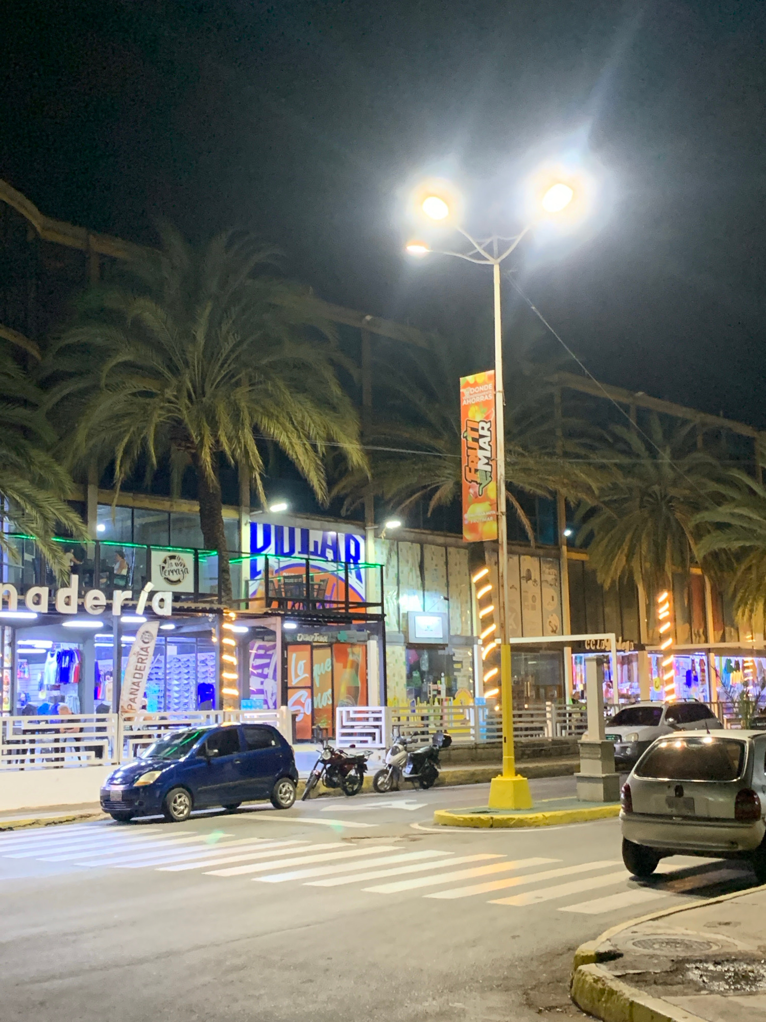 The image depicts a street in Juan Griego, Venezuela at night. Street lights illuminate the scene. Palm trees are visible on the left side of the street. Commercial buildings line the right side of th…read more