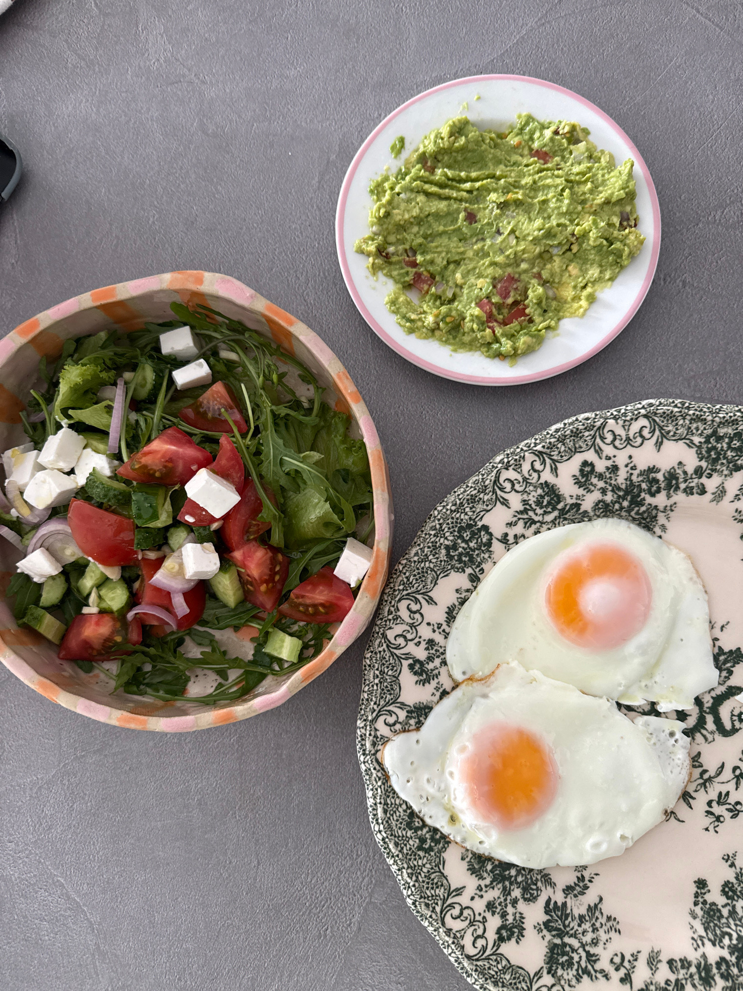 An overhead shot captures a vibrant and diverse meal laid out on a textured, plain gray tabletop, typical of a healthy breakfast or brunch in Tel-Aviv, Israel. In the upper left, a small white plateβ¦read more