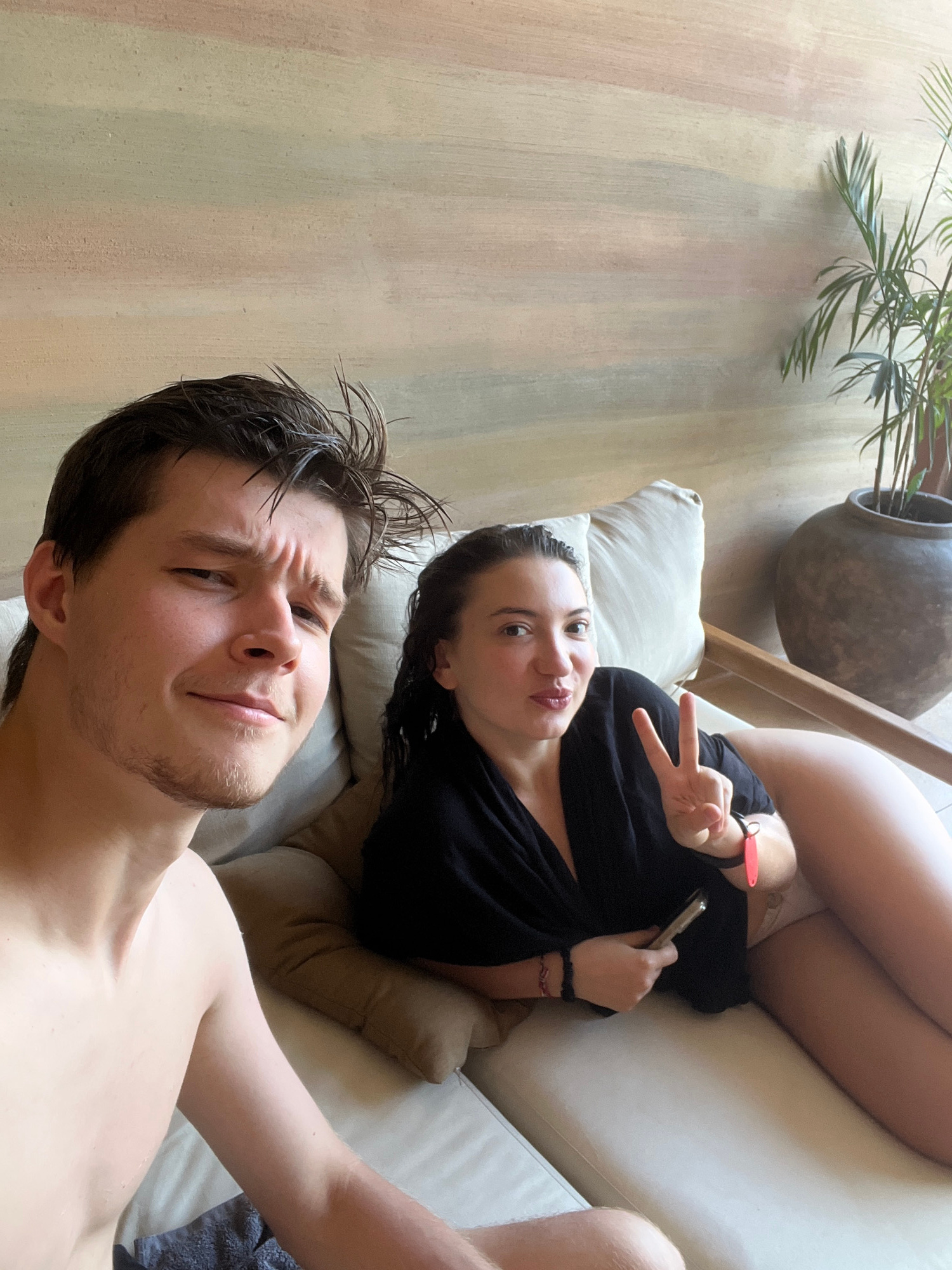 A low-angle selfie shows two people lying on a padded lounger in what appears to be an indoor setting in Pecatu, Indonesia. The flooring has a muted beige and tan vertical striped pattern. A potted pl…read more
