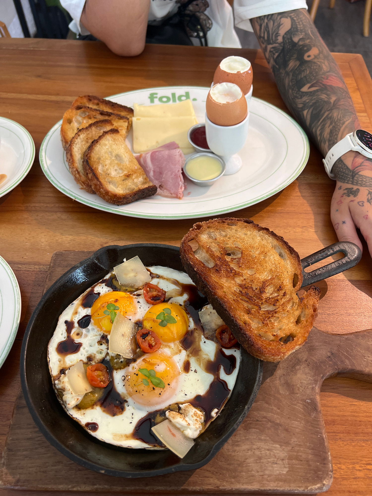 A medium-angle shot depicts an overhead view of a breakfast meal served on a wooden table, possibly in North Kuta, Indonesia. A person's arm with tattoos and a white smartwatch is visible on the top l…read more