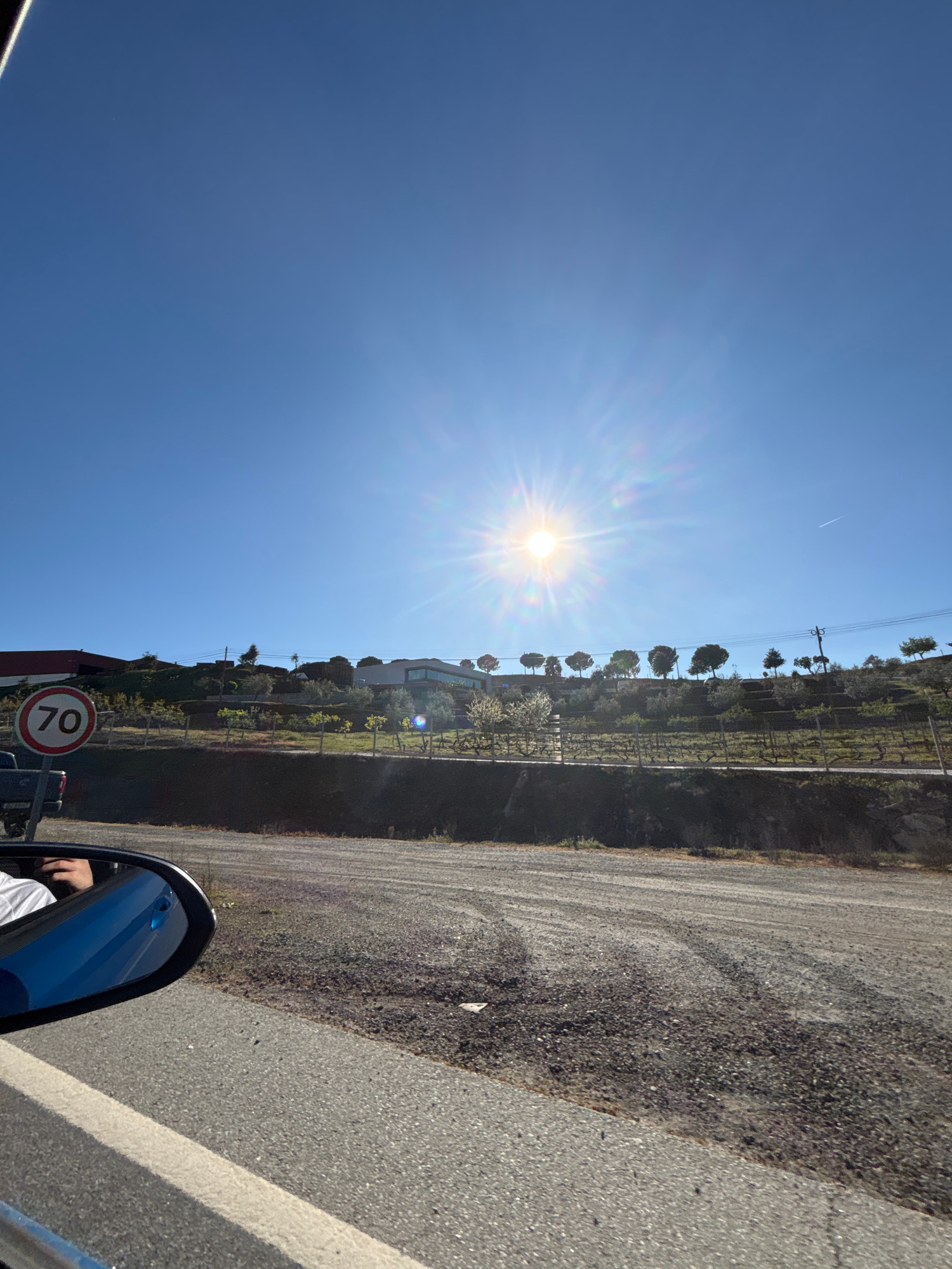 The image depicts a roadside scene in Mirandela, Portugal, captured from inside a moving vehicle. A clear blue sky is visible, with the sun shining brightly, causing lens flare. A rural landscape stre…read more