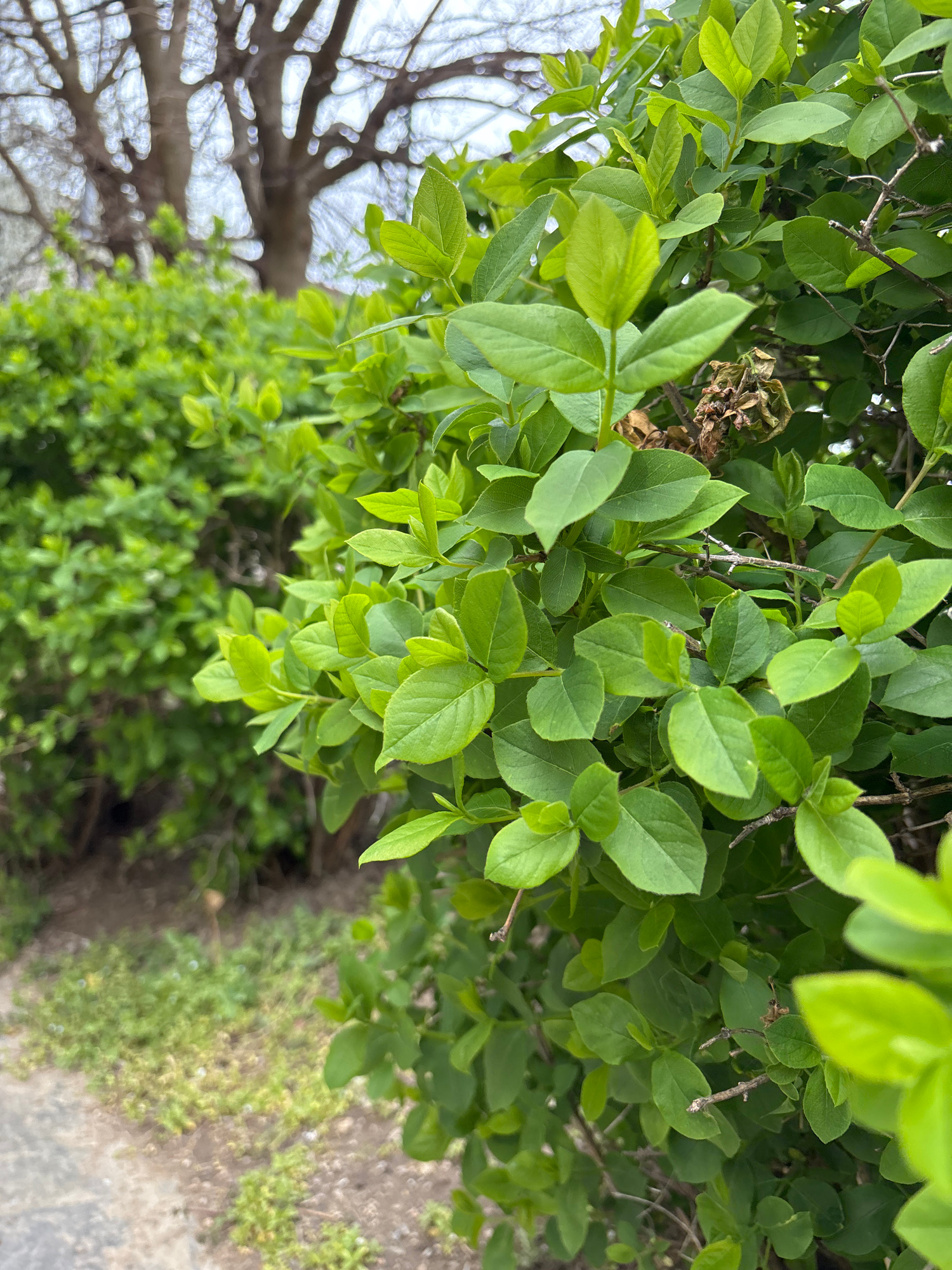 The image shows a close-up view of a bush with green leaves. Some brown, dried-up leaves are also visible. The background is blurred, but a tree branch is visible on the left side of the image, and so…read more