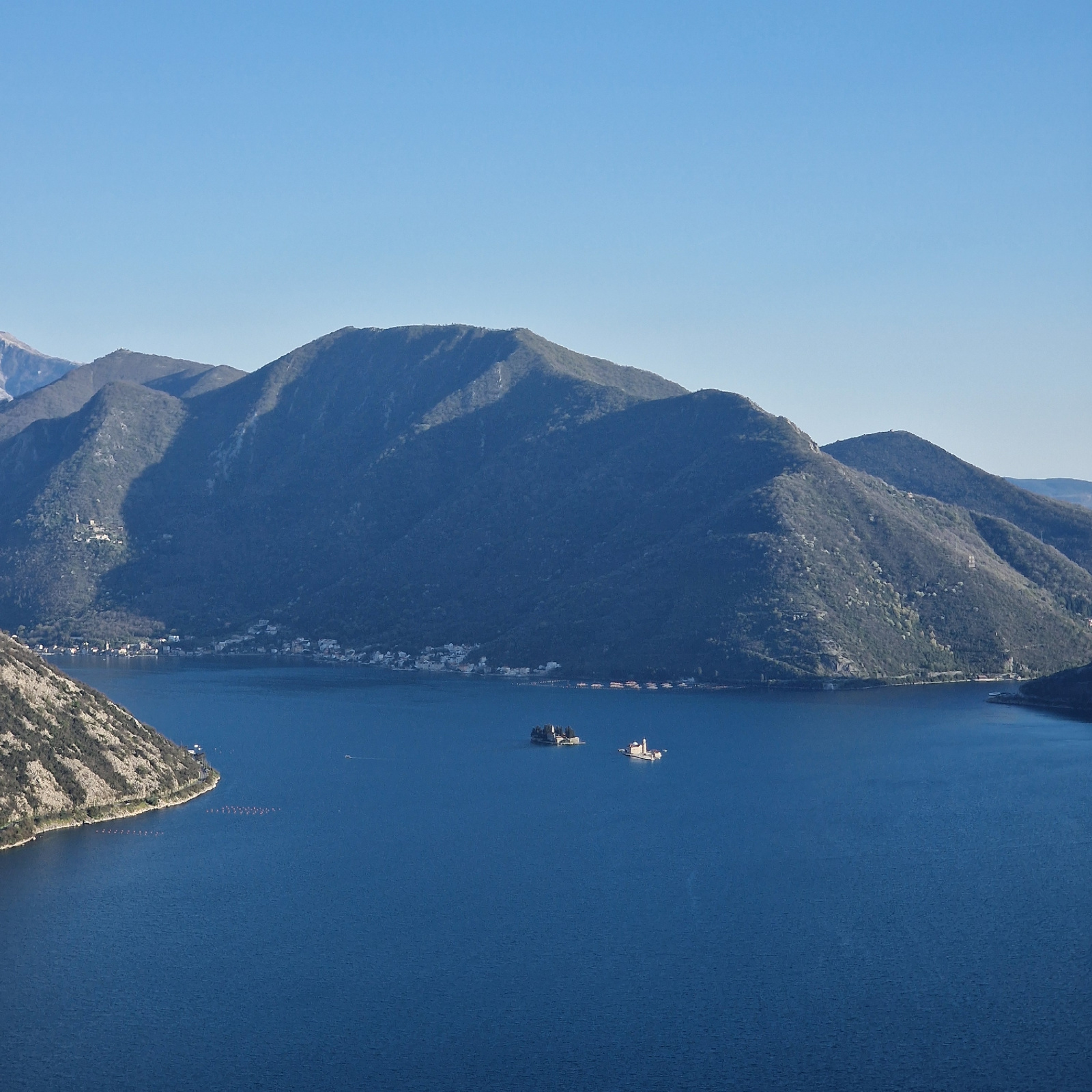 The image depicts a coastal scene in or near Strp, Montenegro. The landscape features a mountainous terrain with a dense forest covering its slopes. A body of water borders the mountains, possibly the…read more
