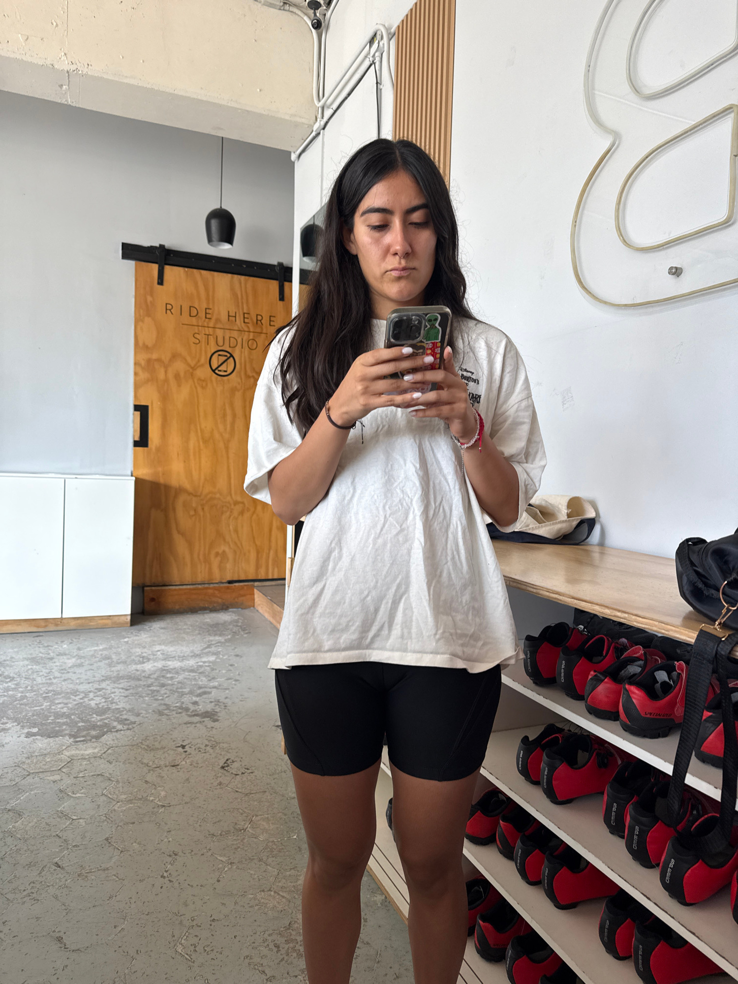 A young woman is taking a selfie in what appears to be a cycling studio or gym. She is wearing a white t-shirt and black shorts. The background shows rows of cycling shoes arranged on shelves and a wo…read more