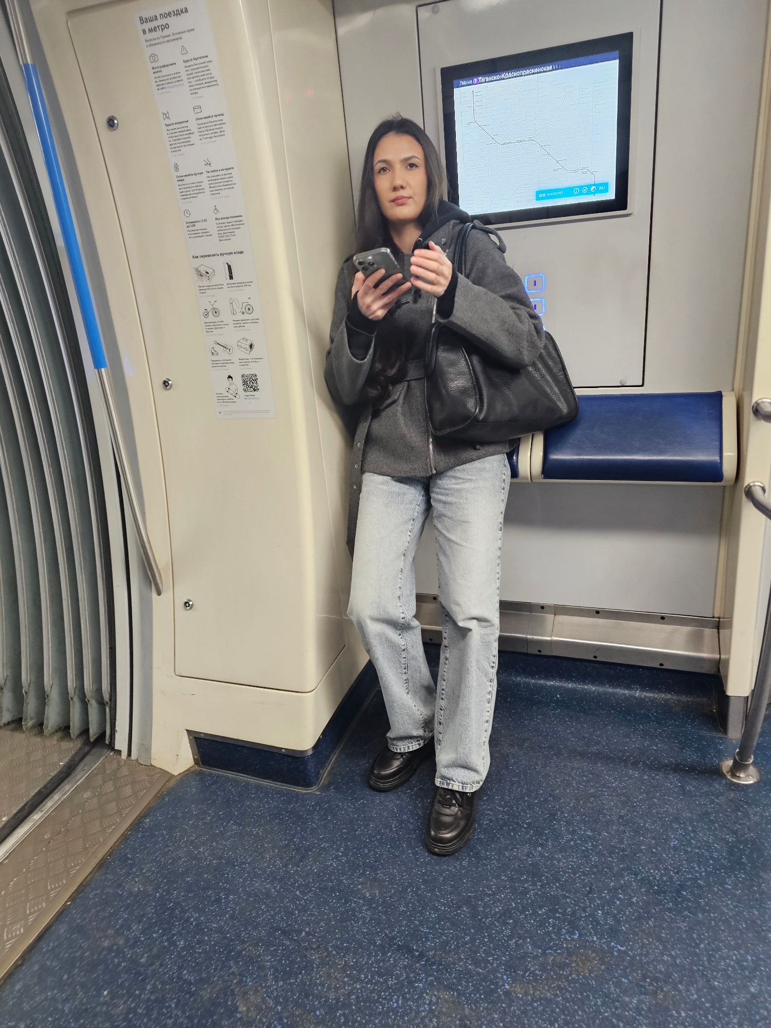 The image shows a woman lying on a bench in what appears to be a subway car, likely in Moscow, Russia, based on the inscription "Лийния Таганско-Краснопресненская в МАРШРУТ RU" which translates to "Ta…read more
