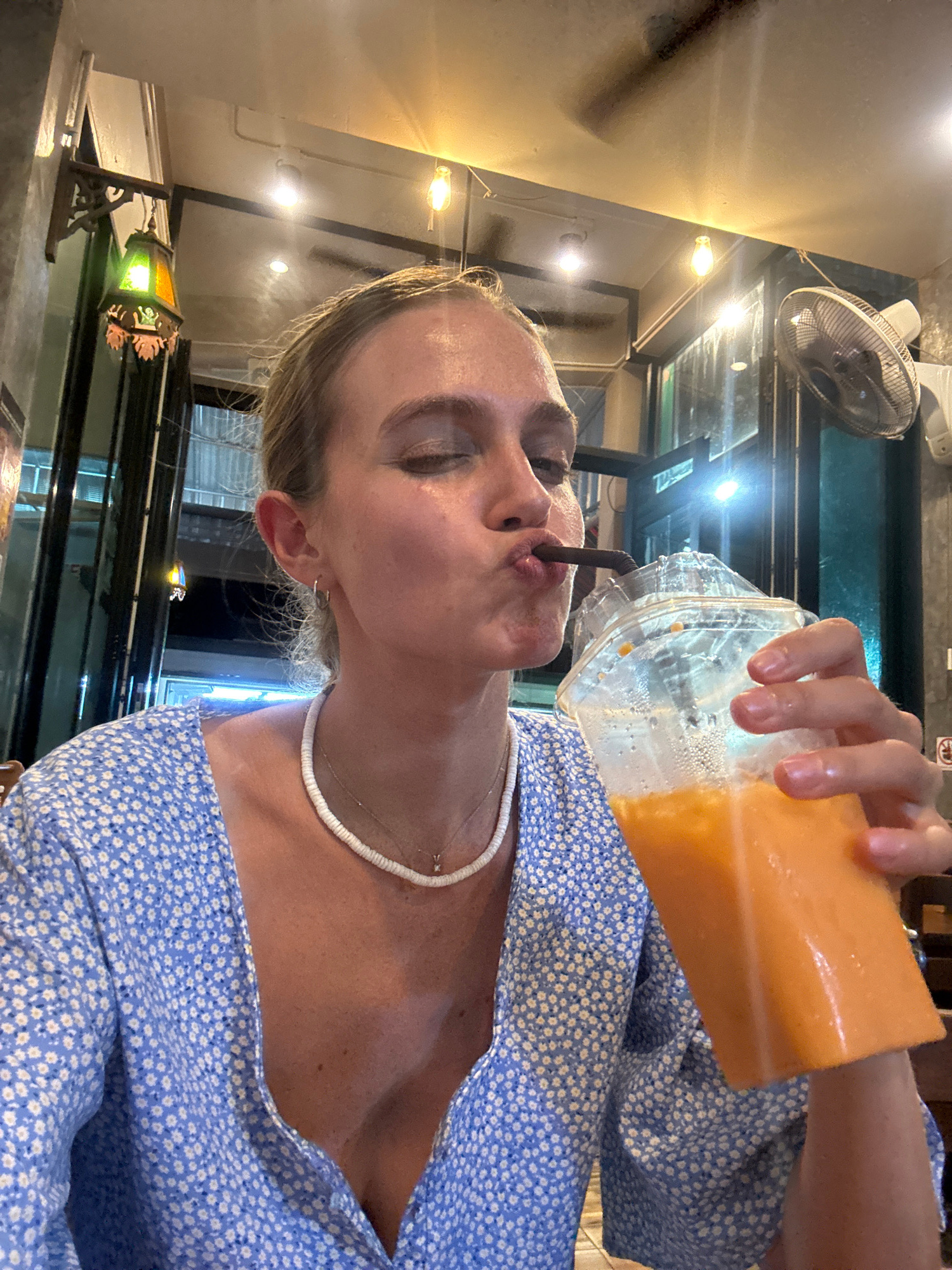 A fair-skinned woman in a blue and white floral dress is drinking a beverage through a straw from a clear plastic cup filled with an orange liquid. She's wearing a white beaded necklace. The photo is…read more