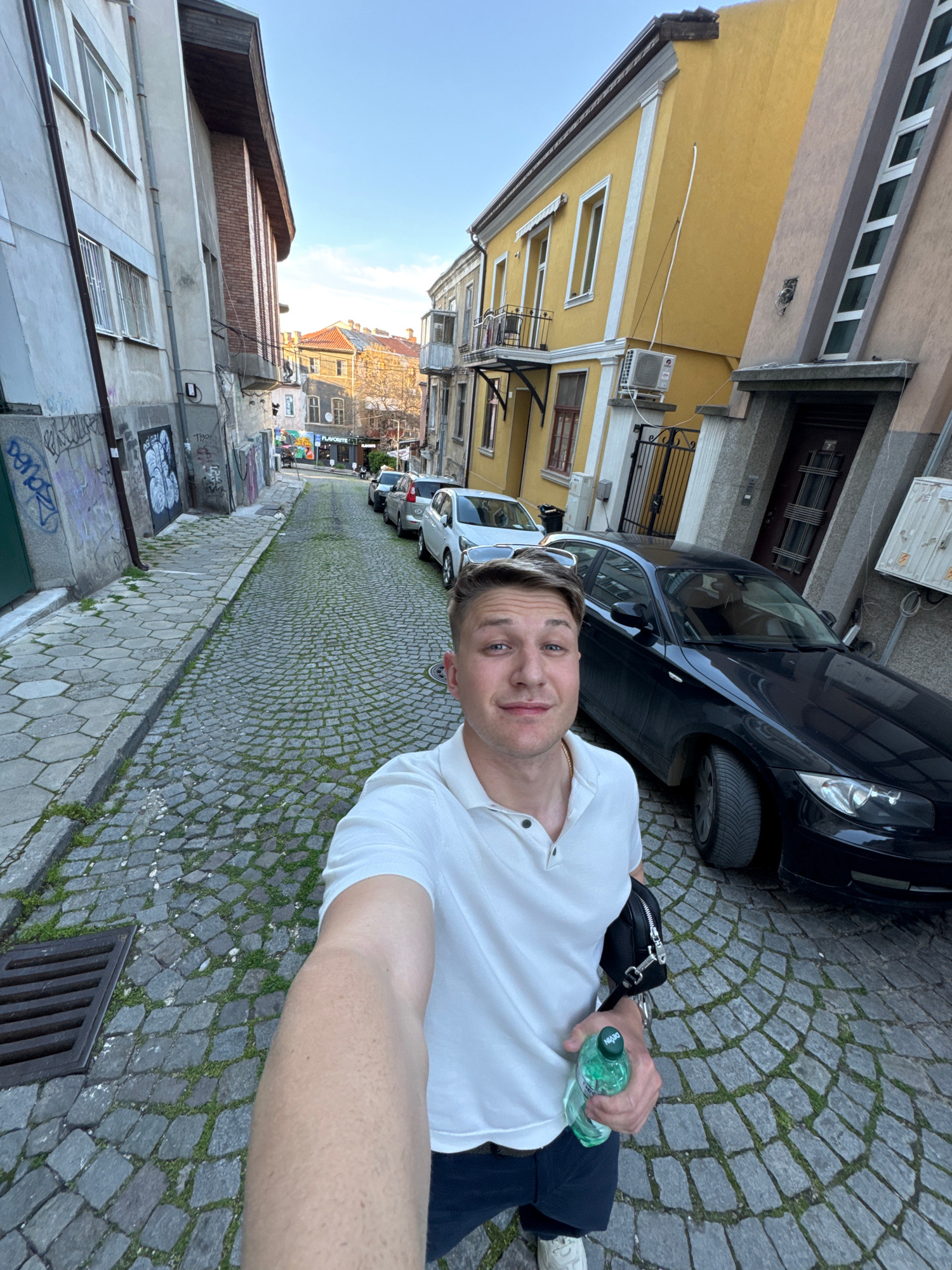 A medium shot shows a fair-skinned man taking a selfie in Plovdiv, Bulgaria. He is holding a bottle of water in his right hand and wearing a white polo shirt. A small black bag is around his waist. Th…read more