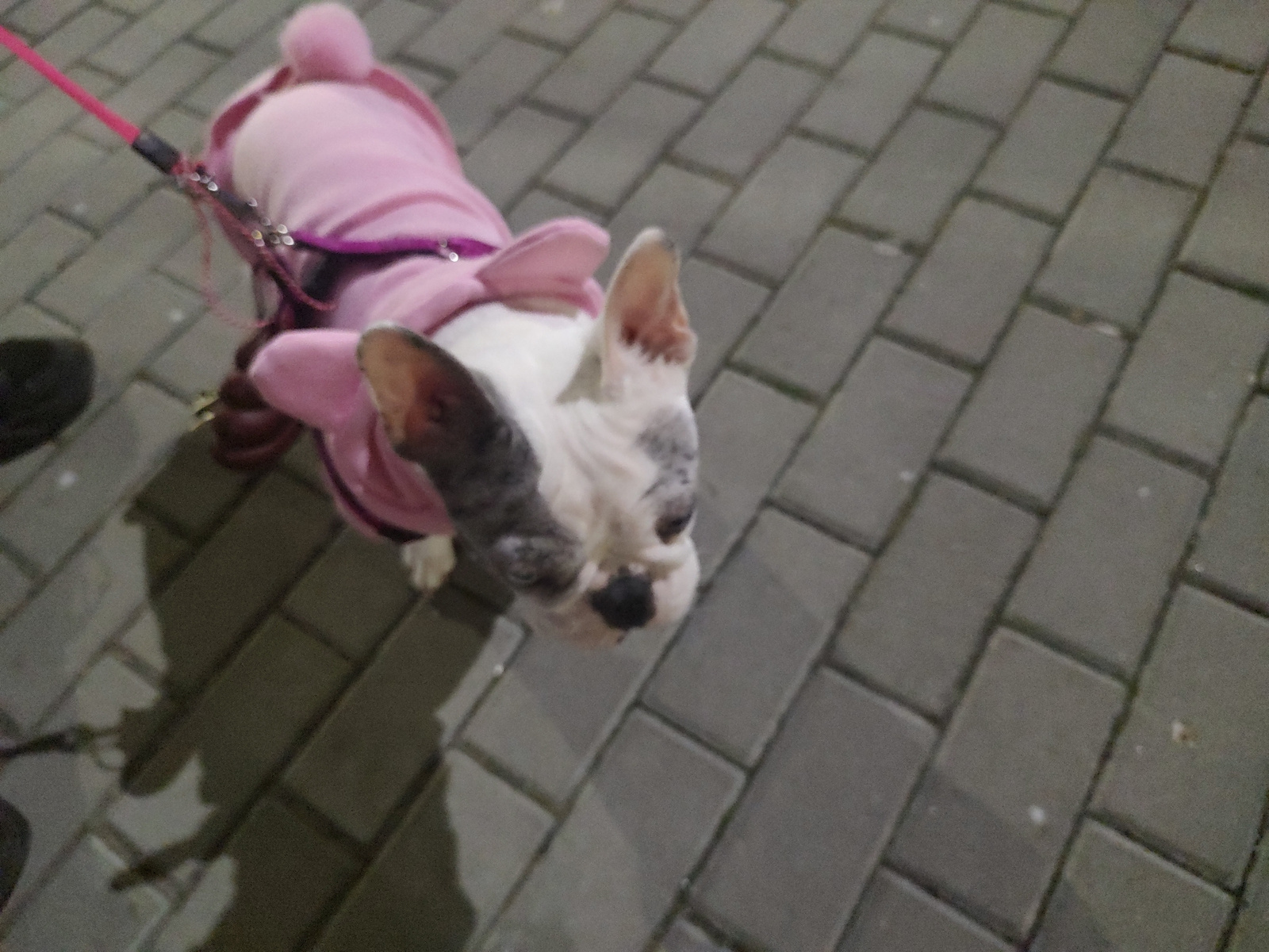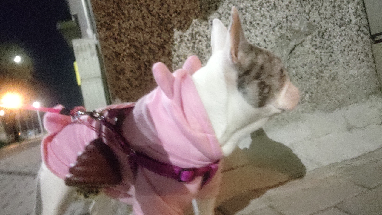 An extreme low-angle photograph captures a white and grey/brown spotted dog, likely a Basset Hound due to its distinctive long, floppy ears. The dog is positioned slightly off-center to the left, look…read more