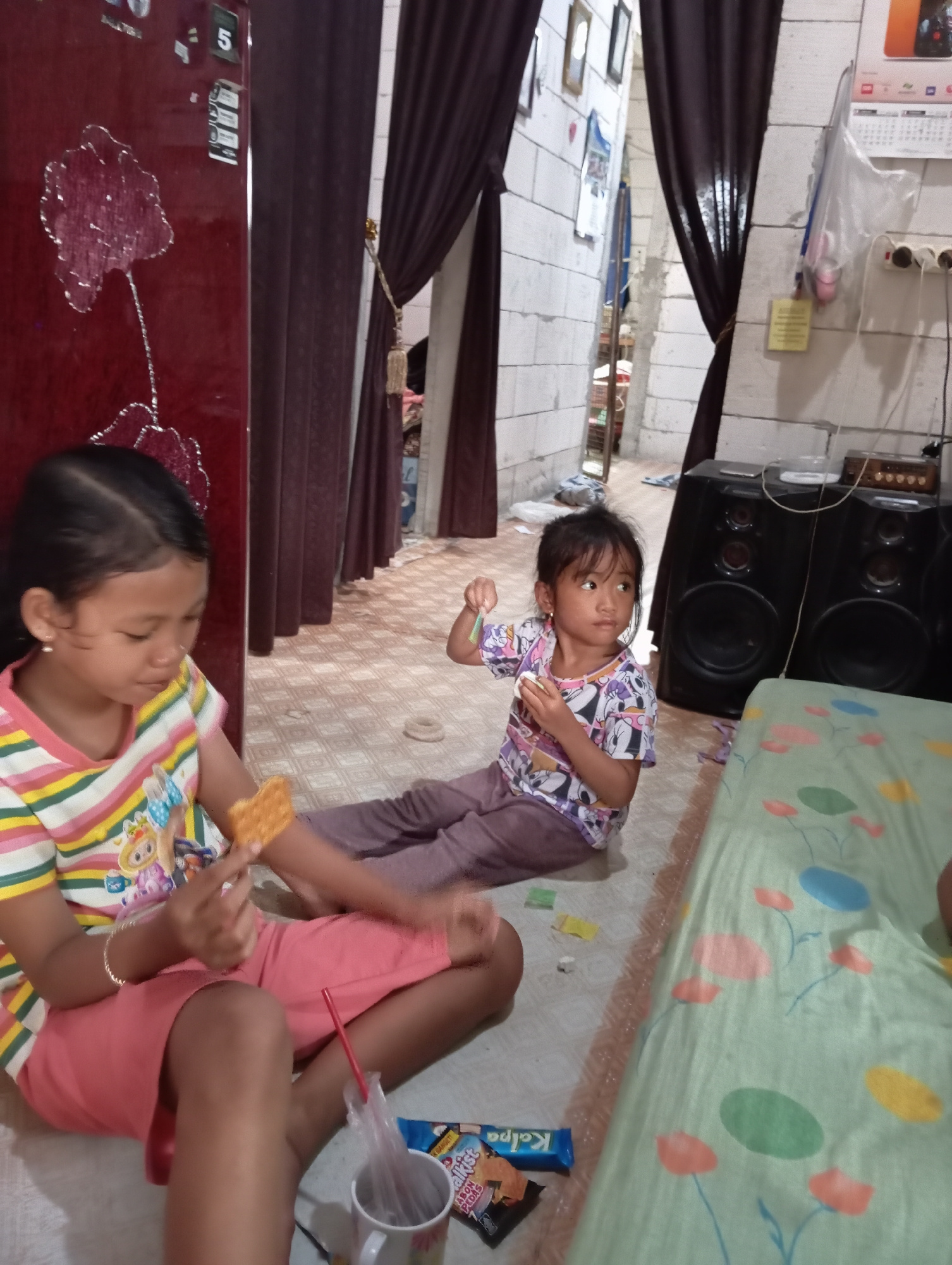 Two young girls are in a room in Baron, Indonesia. One girl in a striped shirt lies on a red-brown surface, holding a cracker. The other girl, wearing a purple and white patterned shirt and purple pan…read more