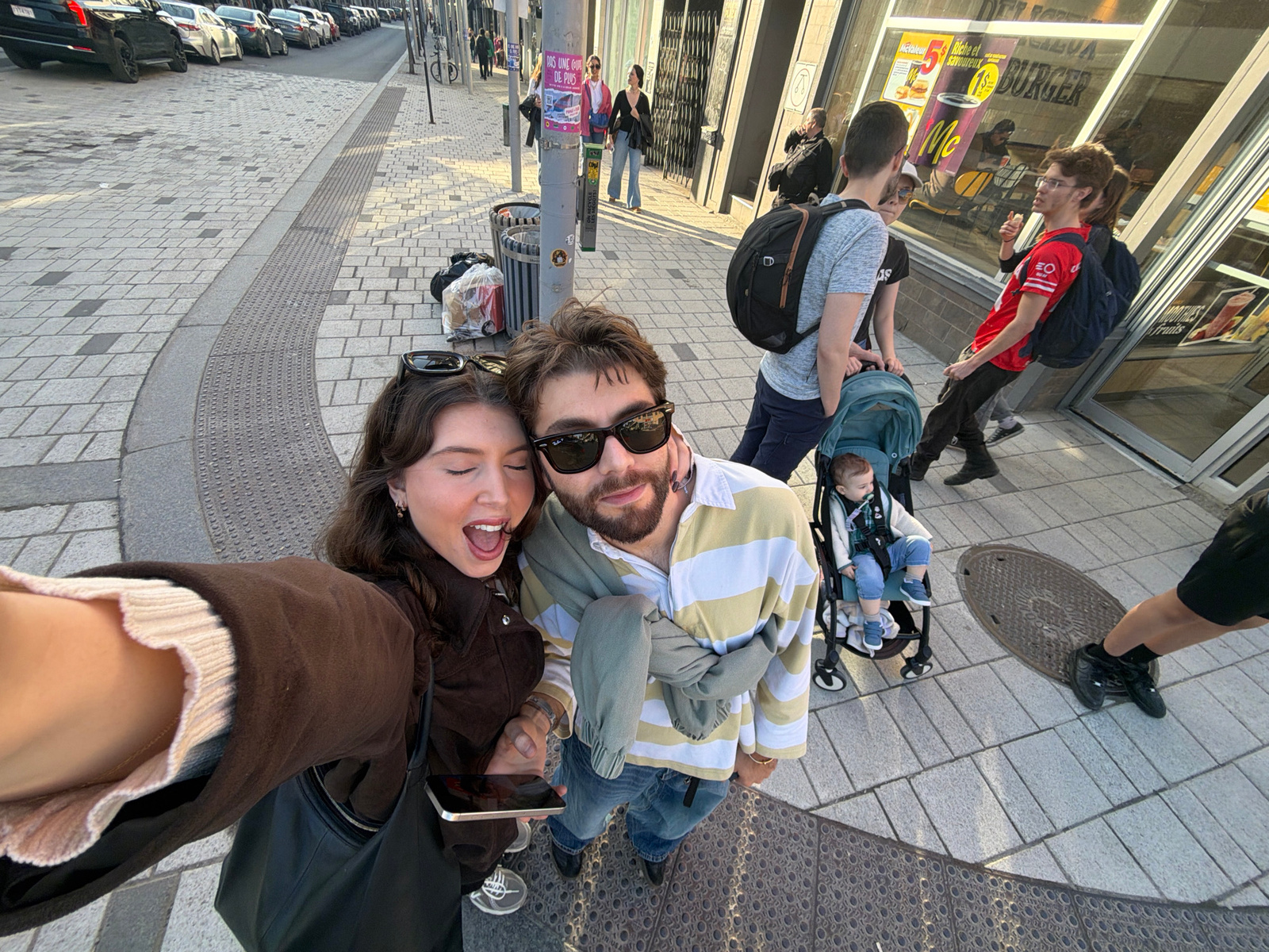 A sideways eye-level shot shows a family portrait and a busy downtown Montreal street. In the foreground, a man and woman take a selfie, their faces close together. The man has a beard and sunglasses…read more