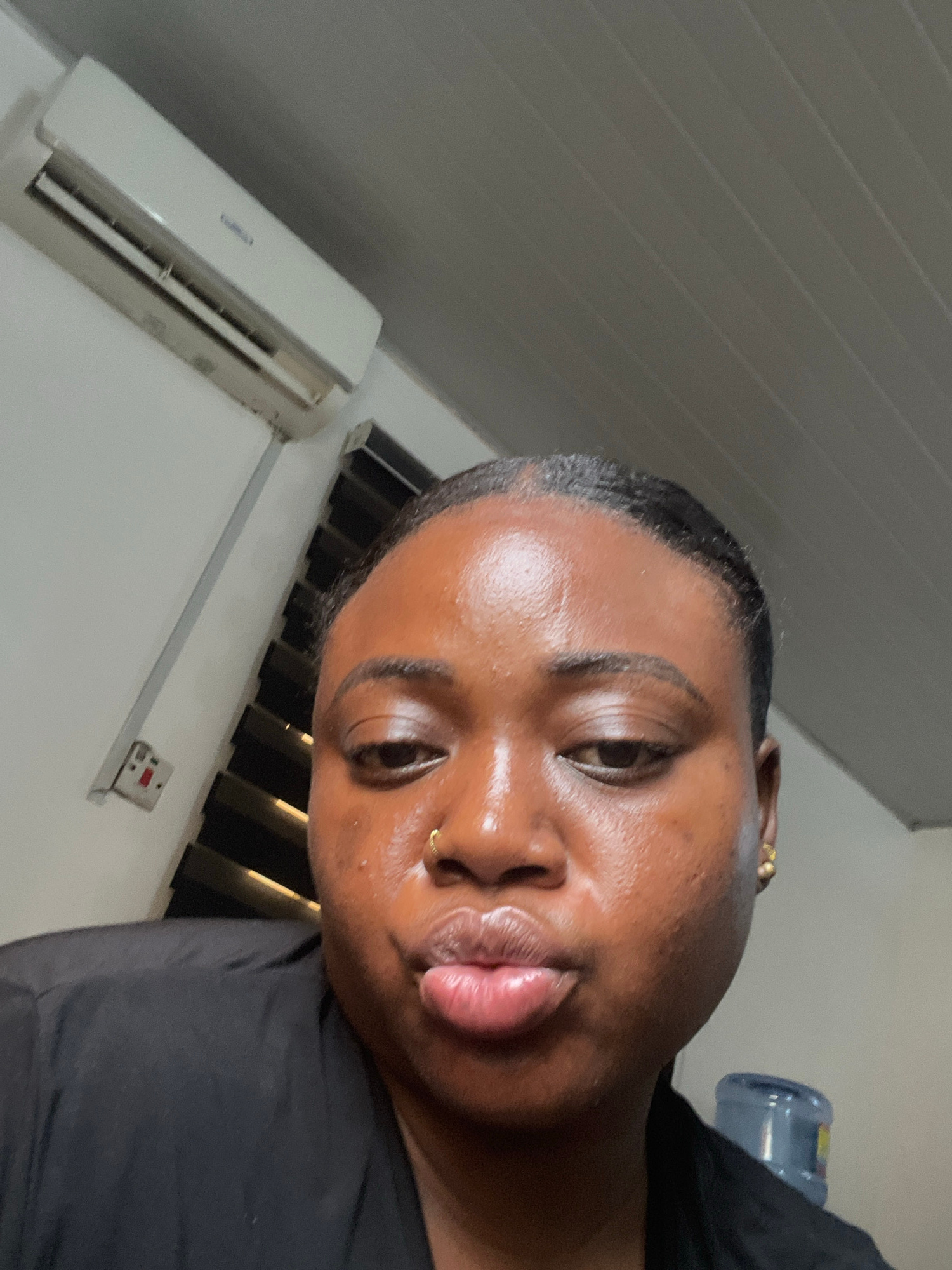 The image shows a dark-skinned woman with short, dark hair, posing indoors. She has a nose ring and her lips are slightly pursed. She is wearing a black garment. In the background, there is an air con…read more