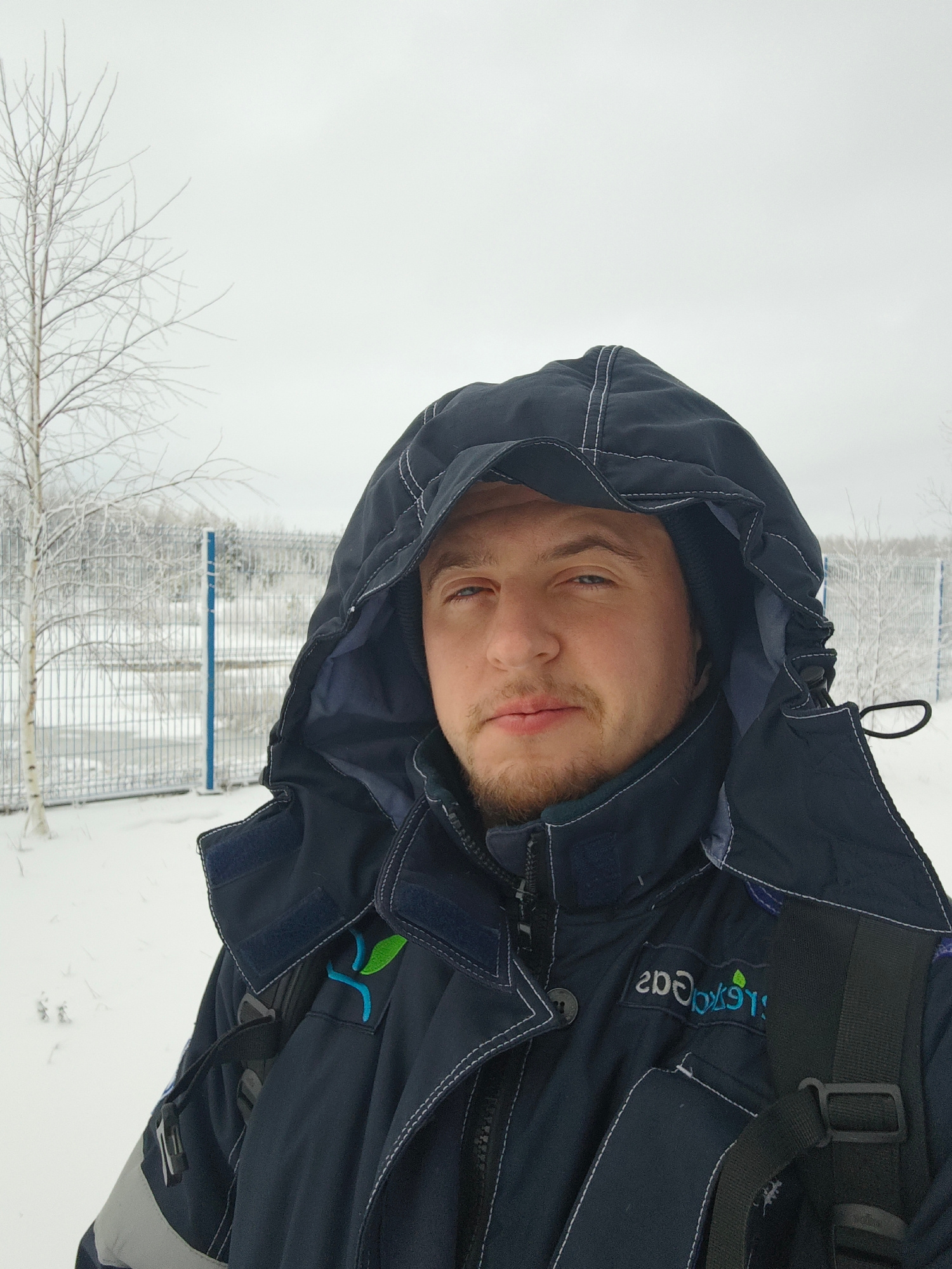 A man wearing a dark blue hooded jacket with a "Газпром" logo stands in a snowy outdoor setting. The man has a light complexion, blue eyes, and a beard. The background includes a snow-covered landscap…read more