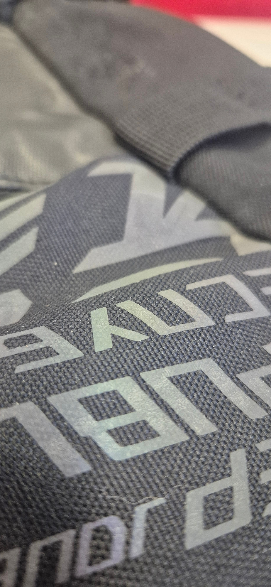 This close-up image presents a detailed view of a dark grey or black textured fabric, likely a synthetic material given its visible weave. The fabric is adorned with a repeating pattern of stylized, gā¦read more