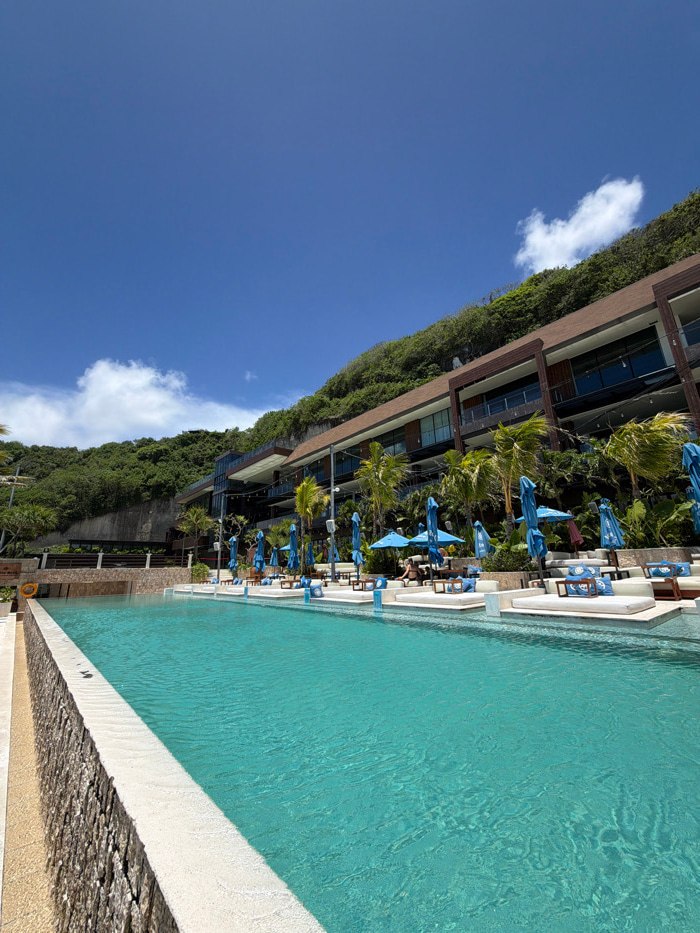 A bright blue swimming pool occupies the right side of the frame, bordered by a white coping. Beyond the pool, a building nestled into a lush, green hillside is visible. Numerous blue umbrellas and lo…read more