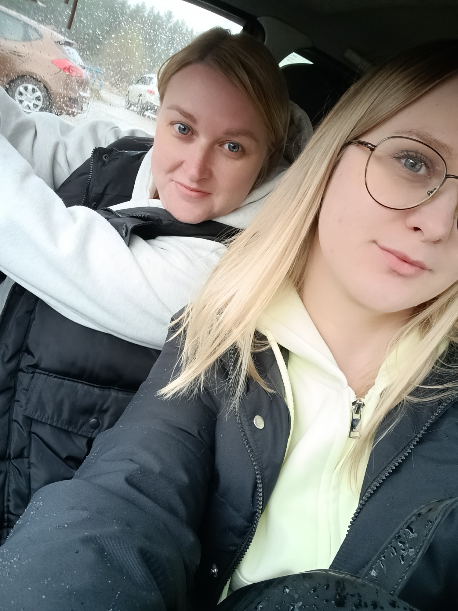 Two women are captured in a selfie-style photograph taken from inside a car in Noviy, Russia. The image is likely taken during the day under overcast or wintry conditions, given the visible moisture o…read more