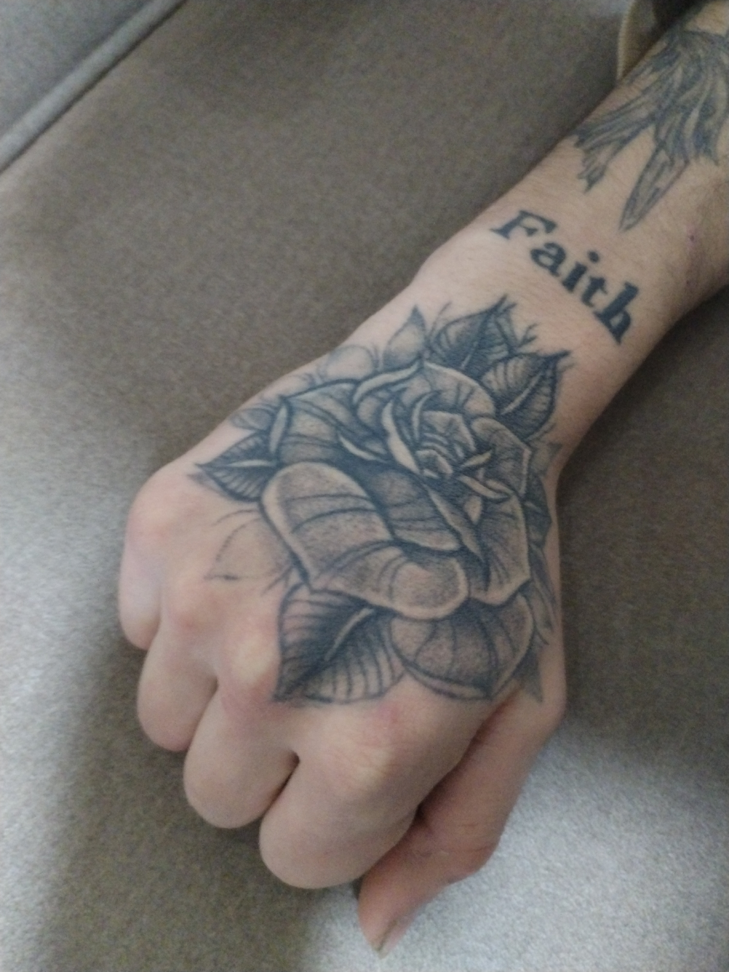 The image shows a person's hand and forearm with several tattoos. A large, detailed rose tattoo is prominently displayed on the back of the hand. The word "Faith" is tattooed on the forearm, near theβ¦read more