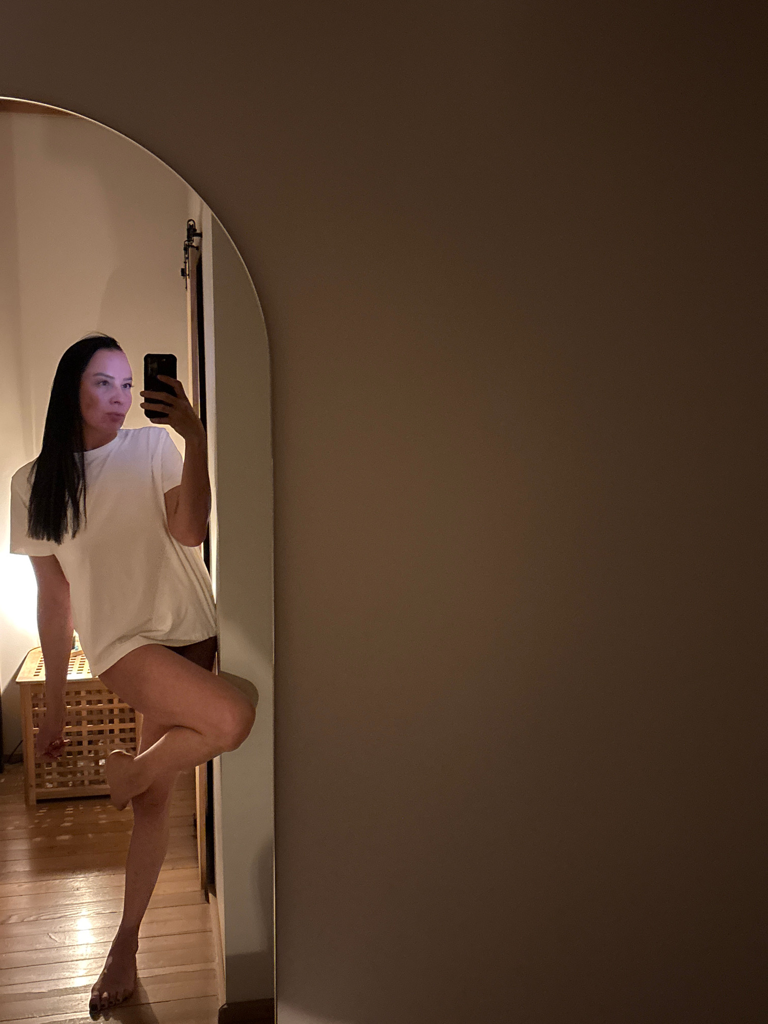 A woman in a white t-shirt is taking a mirror selfie in a room with hardwood floors. There is a lattice-patterned furniture piece near her legs. The location is not specified in the image and cannot b…read more