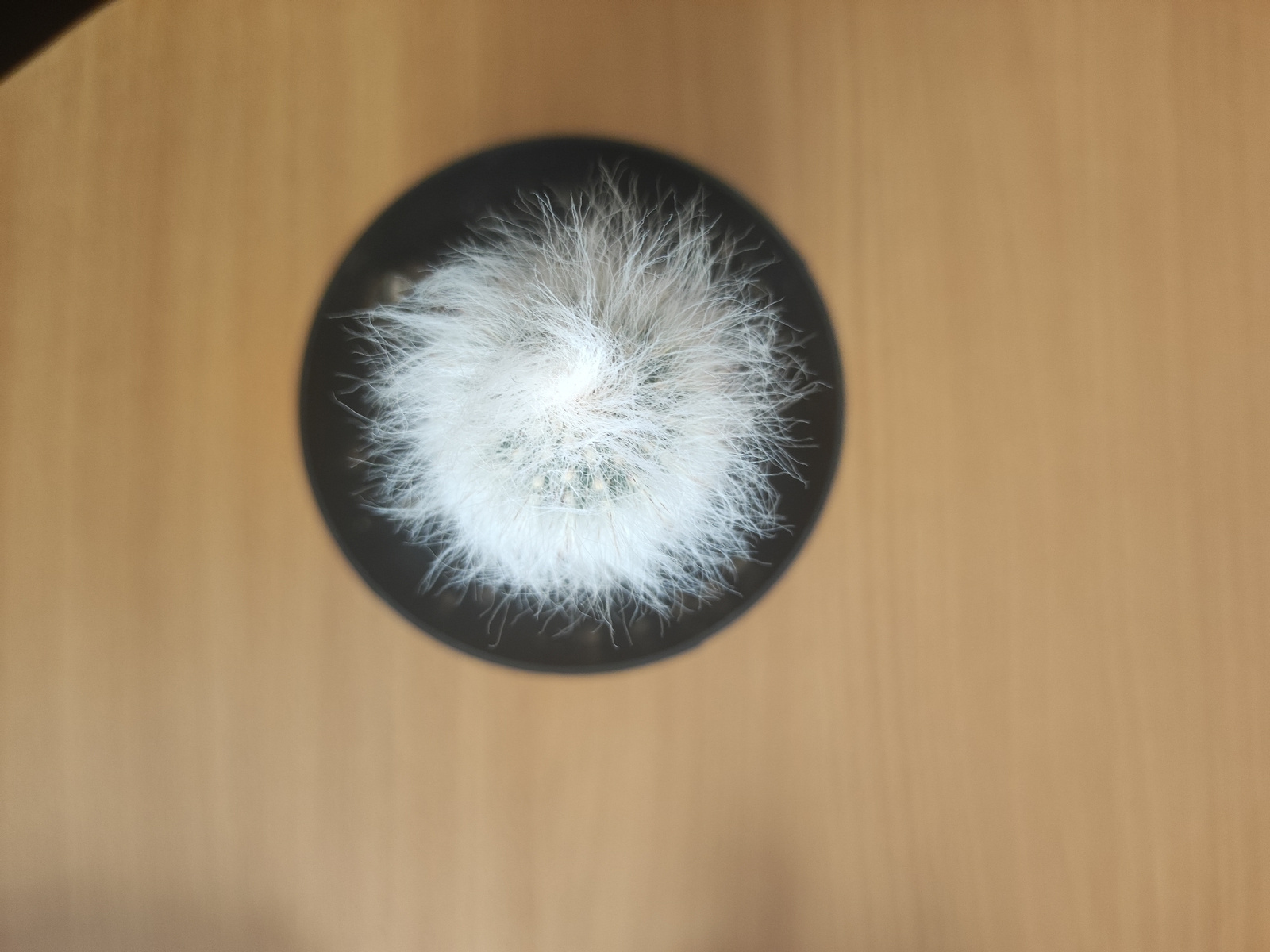 A top-down shot shows a potted cactus with abundant white, hairlike spines, sitting on a light brown wooden surface. The plant is contained in a black, round pot. The surface appears to be a tabletop…read more