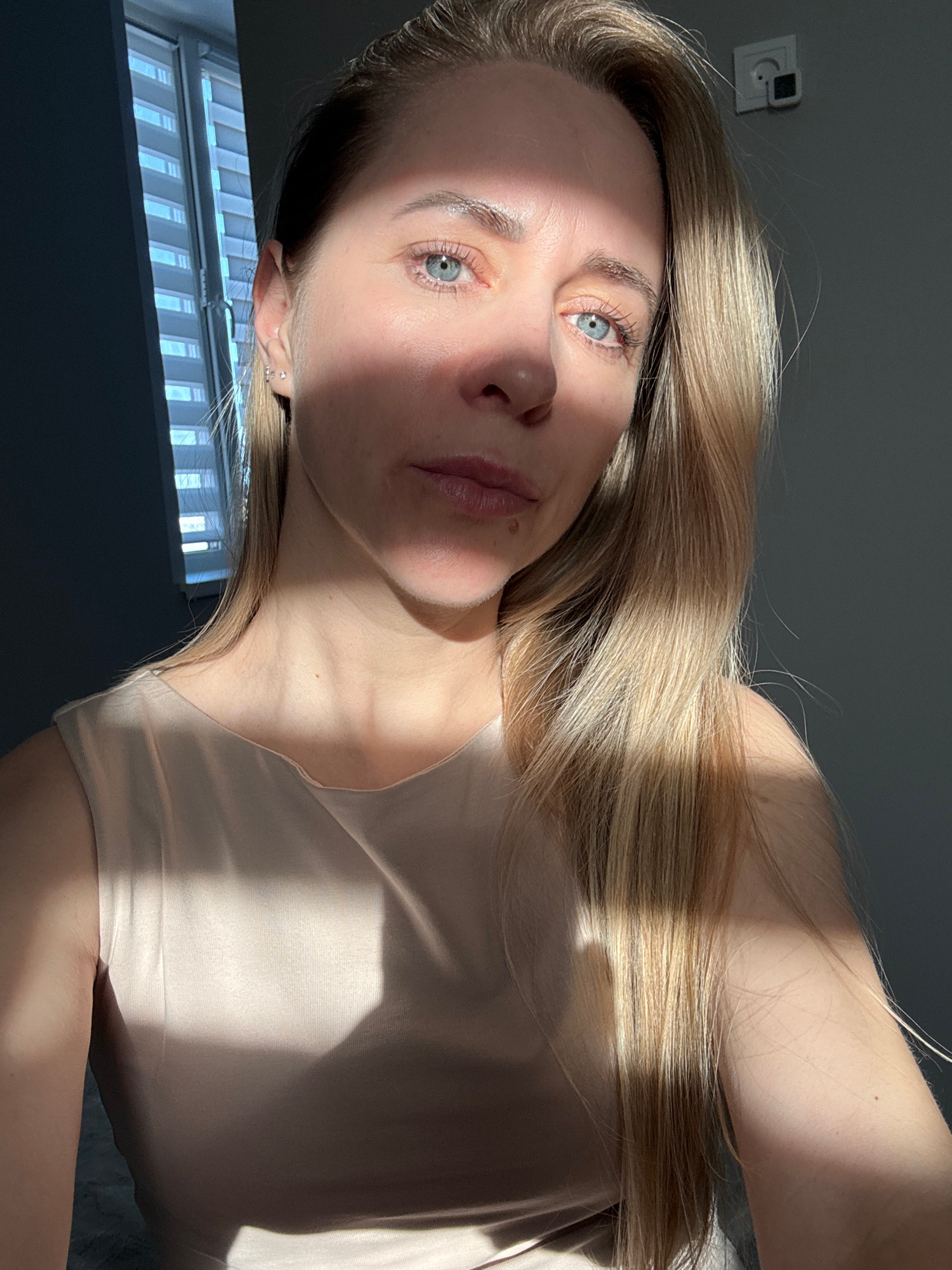 The image is a close-up, rotated selfie of a young woman indoors in Chaikovsky, Russia. She has long, straight blonde hair that cascades over her shoulder and chest, illuminated by strong, direct sunl…read more